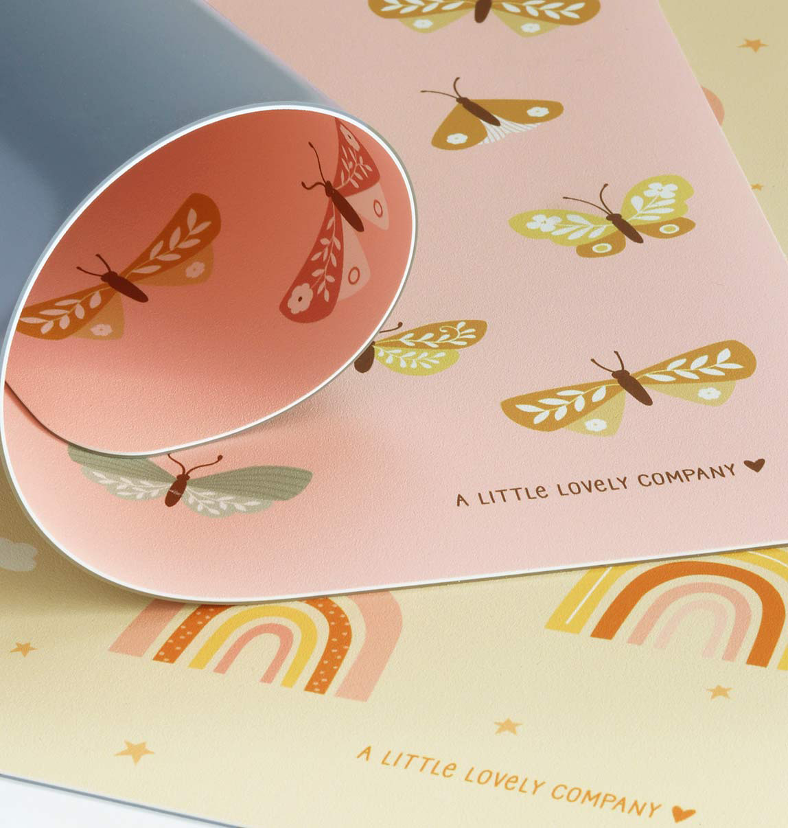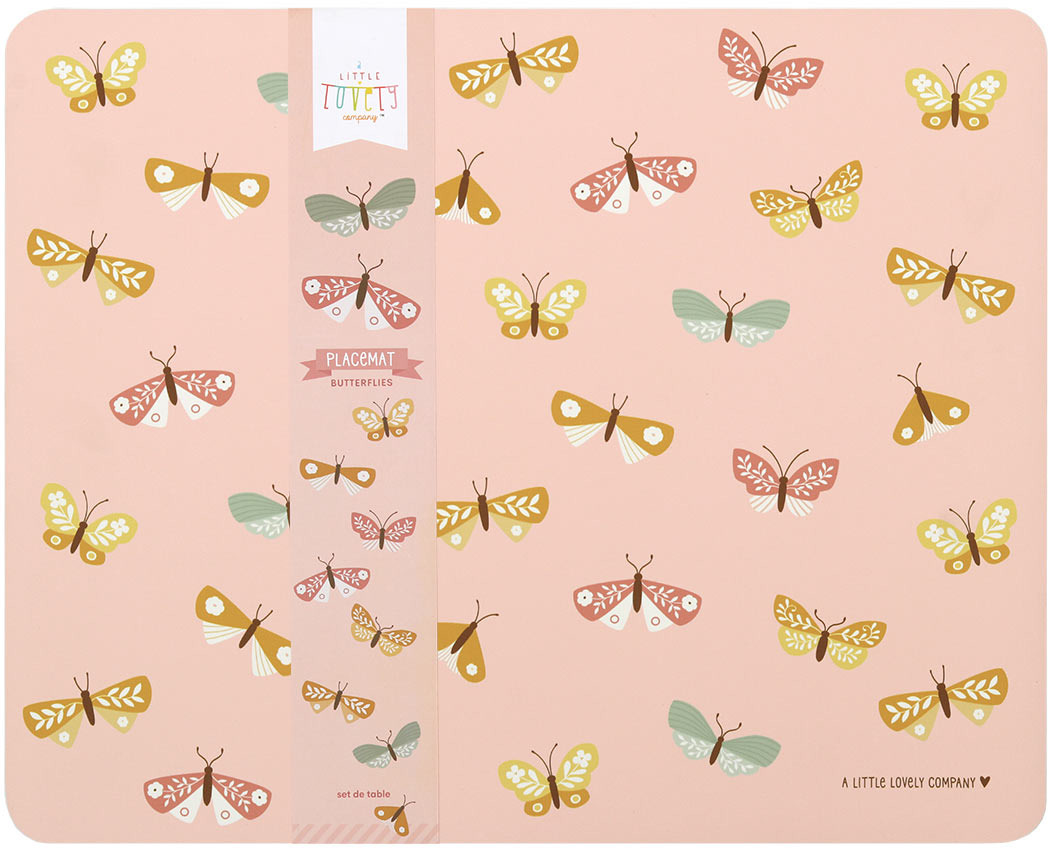 Set de table en vinyle dans un bel imprimé de papillons. Le set de table est à la fois fonctionnel et pratique et peut être utilisé pendant les repas ou le bricolage. Le set de table est doté d'un revêtement antidérapant pour une sécurité supplémentaire. Le set de table est facile à nettoyer, il suffit de l'essuyer avec un chiffon humide. Attention : les aliments et boissons fortement pigmentés peuvent pénétrer dans la surface et provoquer des décolorations.