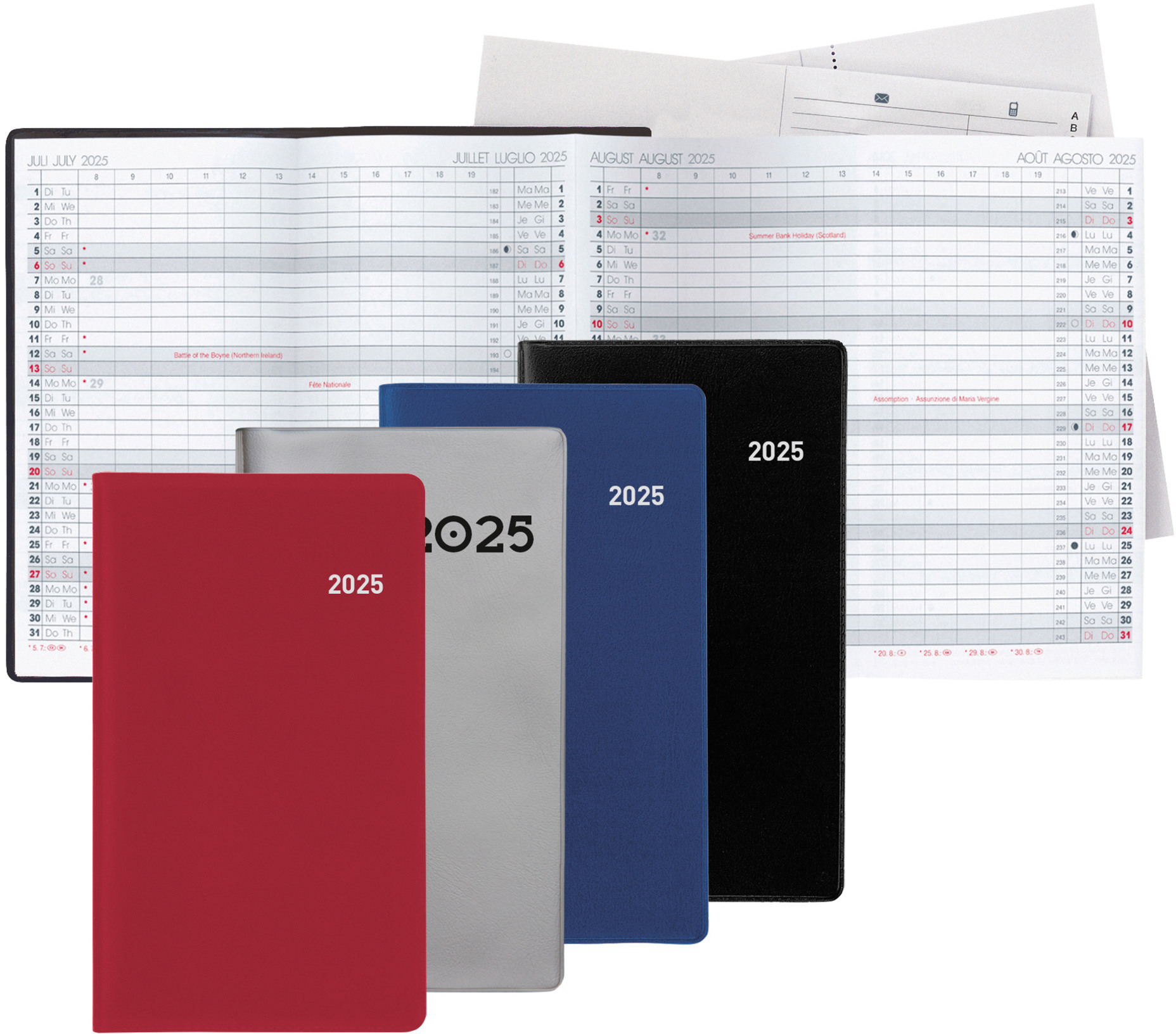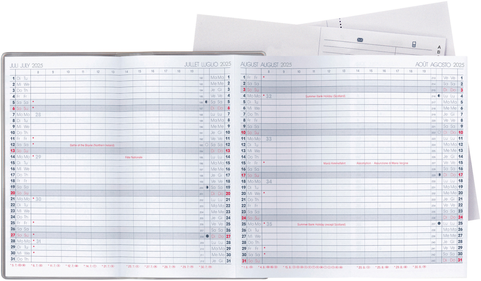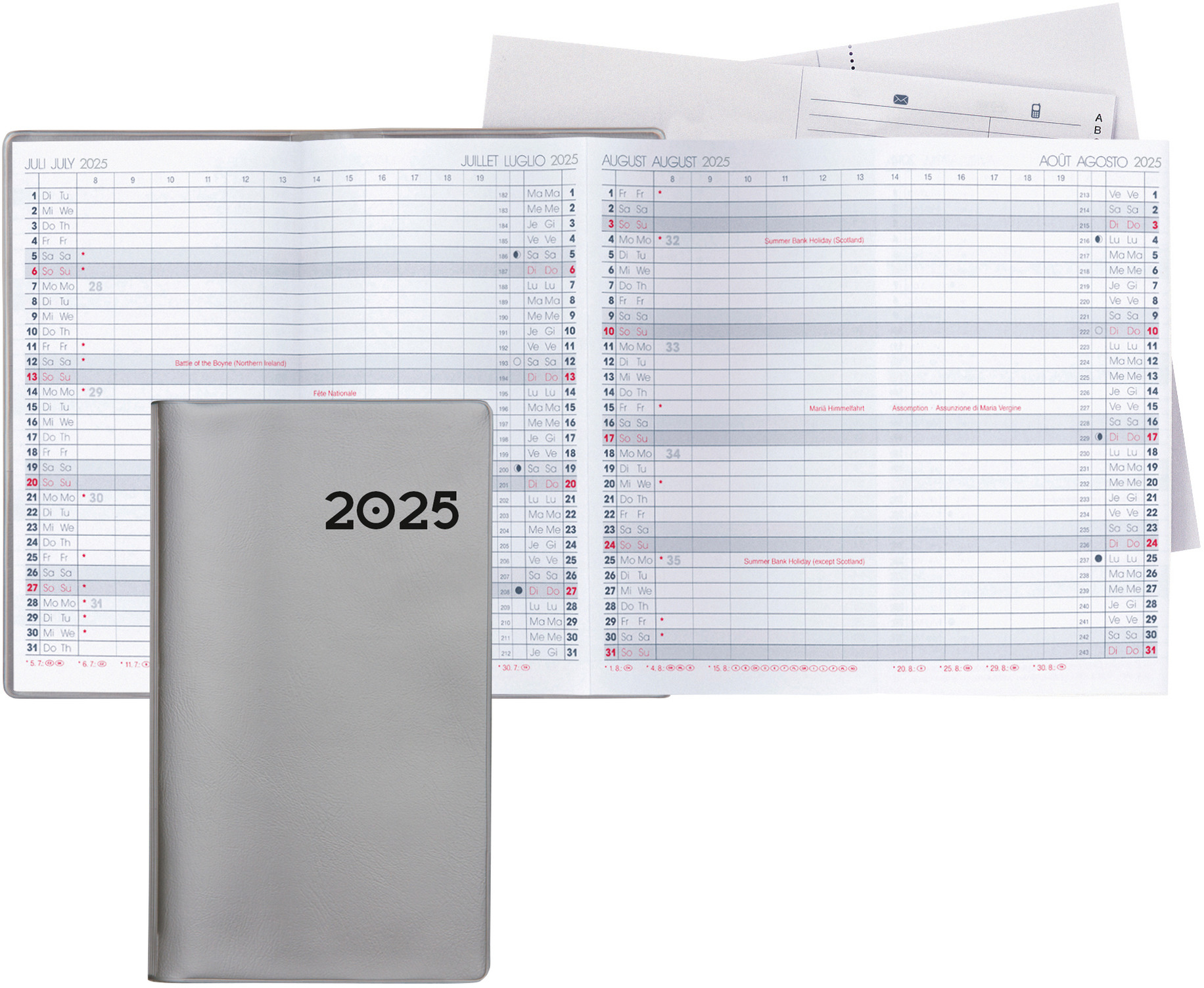 L'agenda Berlin de Biella est idéal pour les planificateurs économes qui souhaitent n'avoir que les entrées les plus importantes dans l'aperçu des 6 mois. L'agenda Berlin est le seul agenda avec un calendrier extensible et contient, en plus du calendrier 6 mois par page, un registre d'adresses et du papier pour prendre des notes.