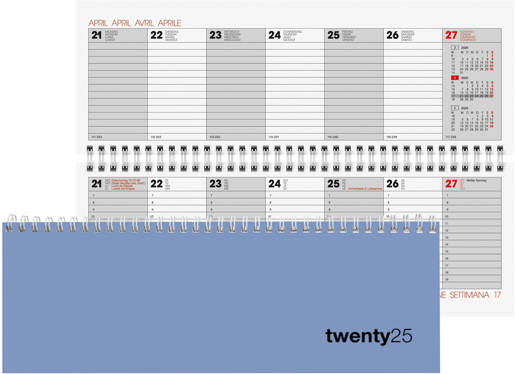Le Pultagenda Biella s'ouvre facilement grâce à sa reliure à spirale et contient le calendrier 1 semaine sur deux pages. Avec un aperçu du mois, une répartition des heures et des champs de notes, le Pultagenda offre beaucoup de place pour écrire tout en étant compact et peu encombrant pour chaque bureau.