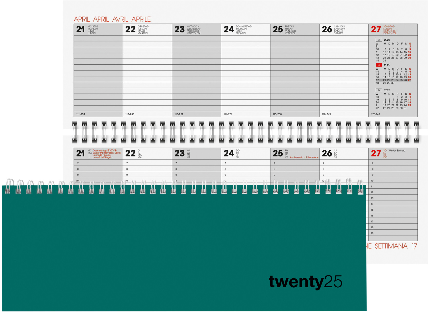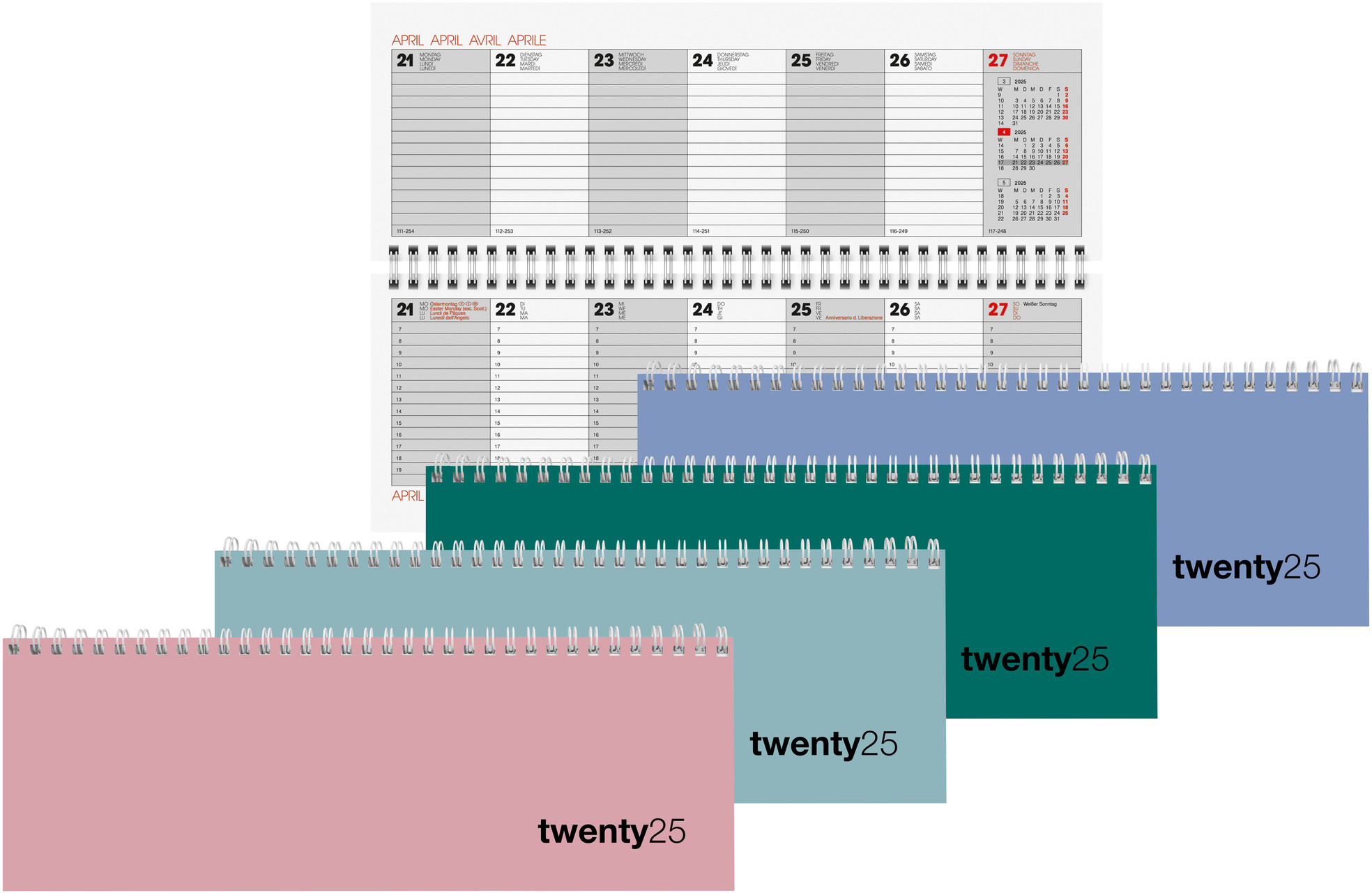 Le Pultagenda Biella s'ouvre facilement grâce à sa reliure à spirale et contient le calendrier 1 semaine sur deux pages. Avec un aperçu du mois, une répartition des heures et des champs de notes, le Pultagenda offre beaucoup de place pour écrire tout en étant compact et peu encombrant pour chaque bureau.