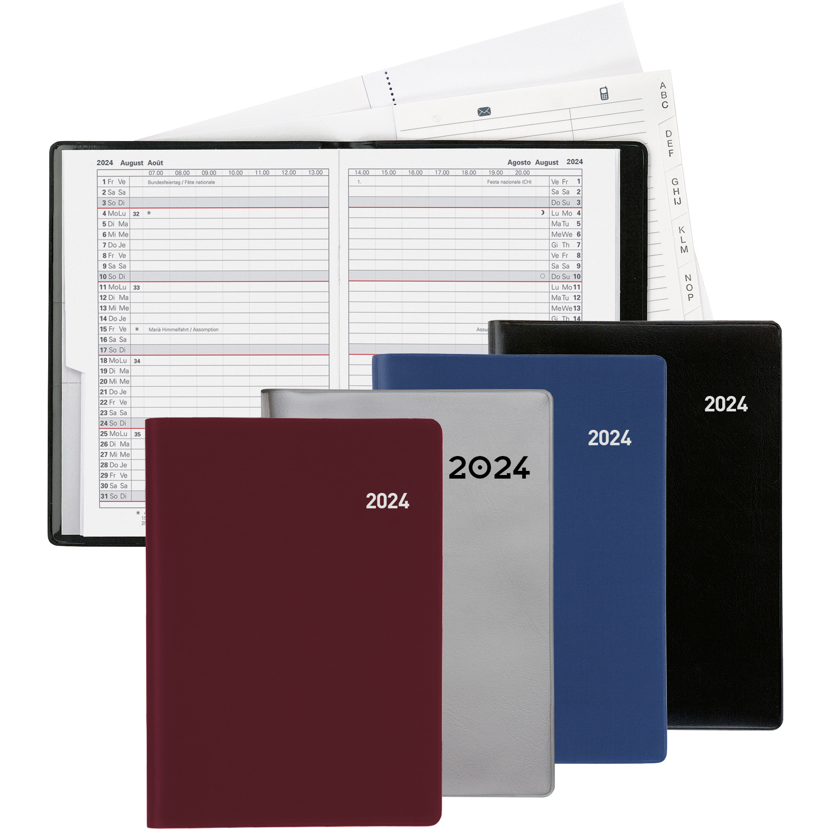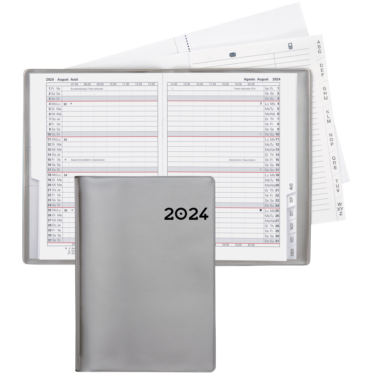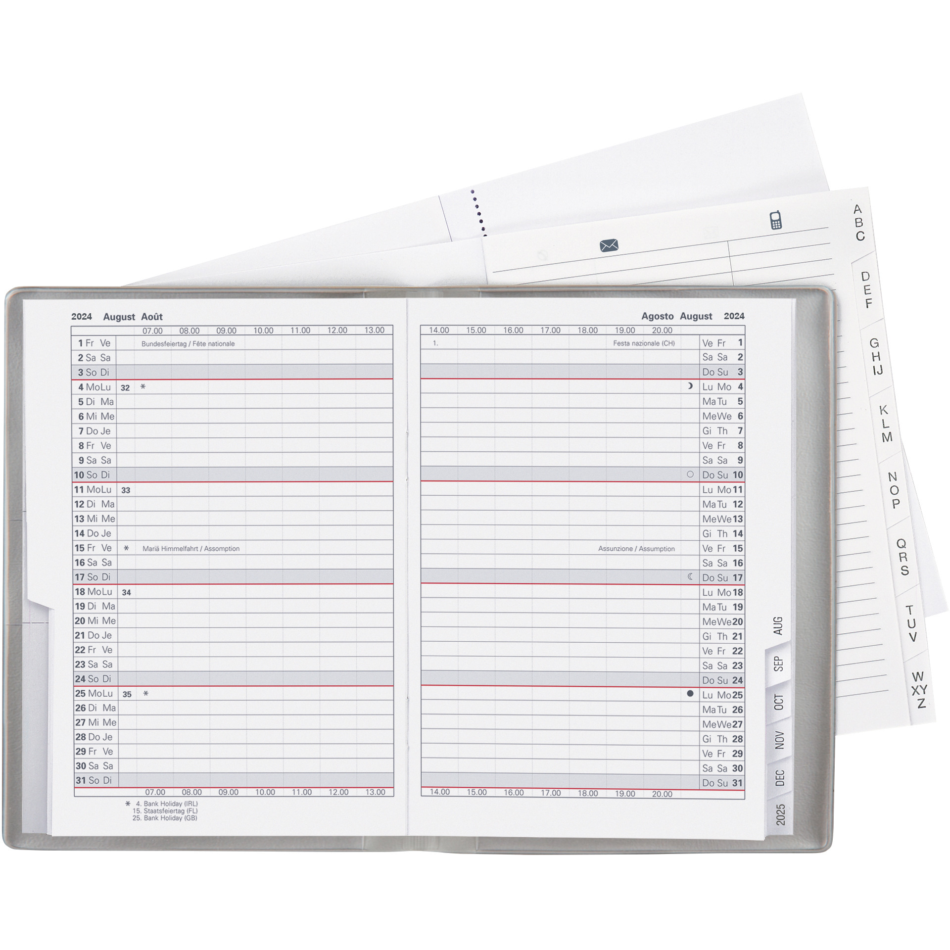 L'agenda Biella Glasgow convient à l'utilisateur qui a besoin de plus de place et contient un calendrier 1 mois sur deux pages. Comme d'habitude, l'agenda contient en plus un registre d'adresses et du papier pour prendre des notes. Format 10 x 13,9 cm. 40 pages, 1 mois sur 2 pages. Étui en plastique. Calendrier d-f-i-gb, 15 mois octobre - décembre, cousu à fil, coupe à onglets. Impression gris/rouge, division des heures 07.00 - 20.00, 1 heure. 16 pages de notes blanches hautement perforées et 16 pages de registre d'adresses interchangeables.