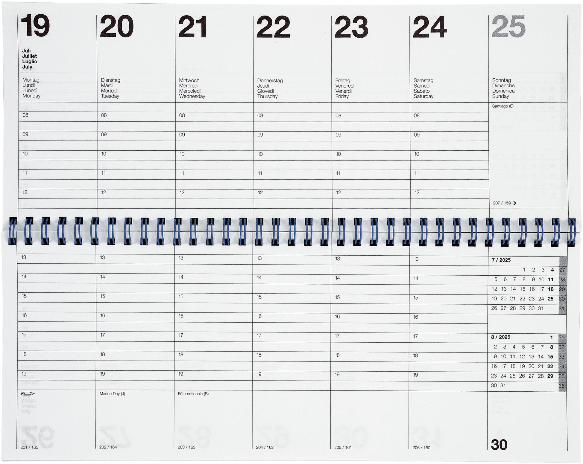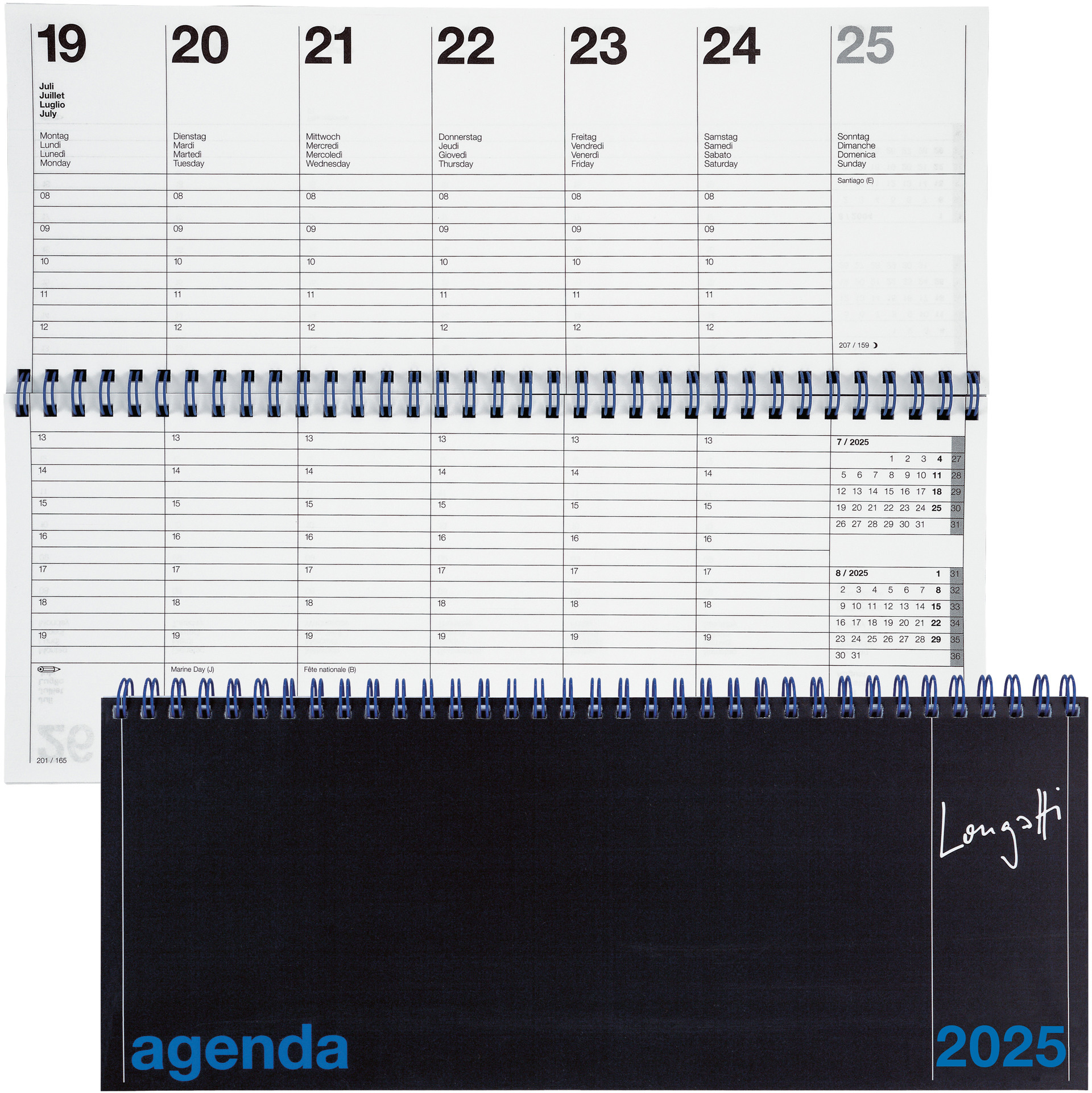 Le Pultagenda Biella s'ouvre facilement grâce à sa reliure à spirale et contient le calendrier 1 semaine sur deux pages. Avec un aperçu du mois, une répartition des heures et des champs de notes, le Pultagenda offre beaucoup de place pour écrire tout en étant compact et peu encombrant pour chaque bureau.