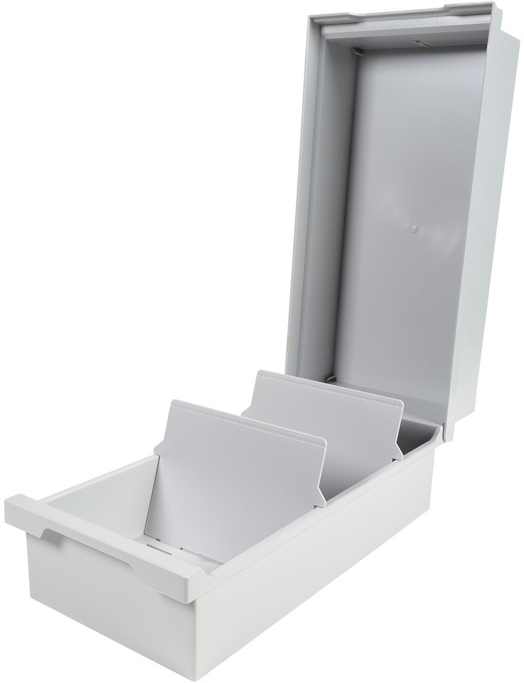 Porteétiquette grand format avec cadre clipsable. Gain de place: le bac peut se loger dans le couvercle aisément amovible (sauf format A4).