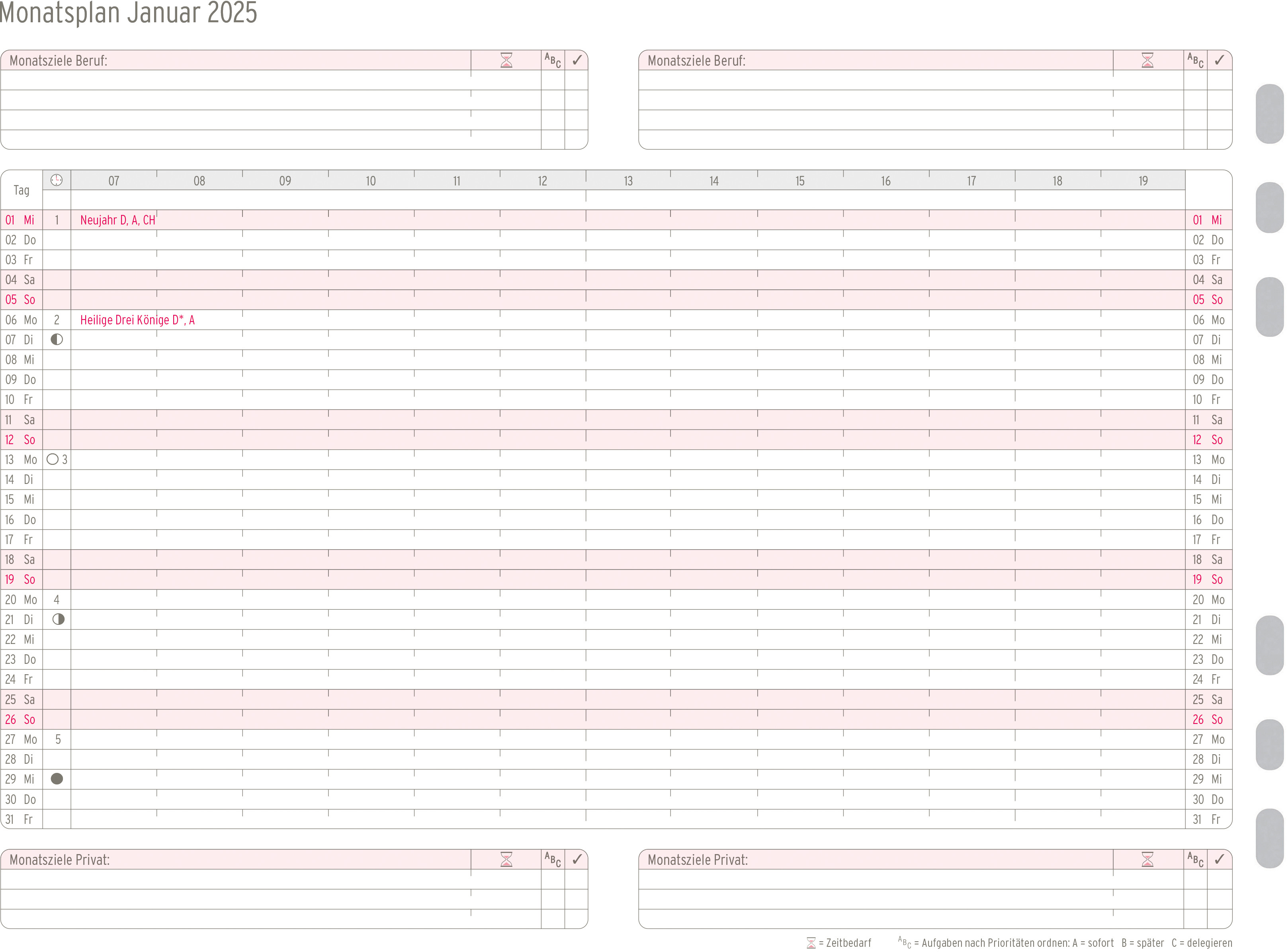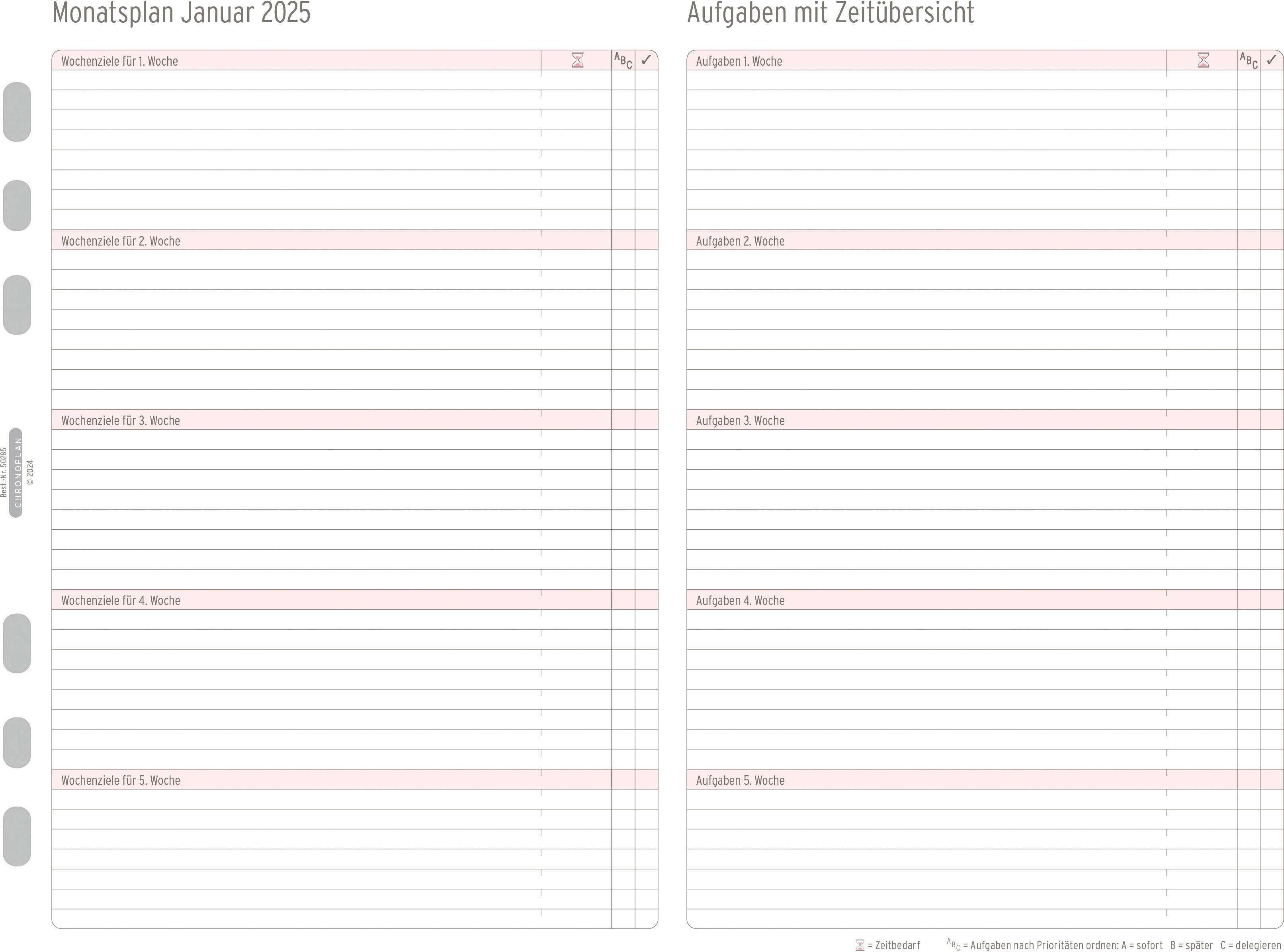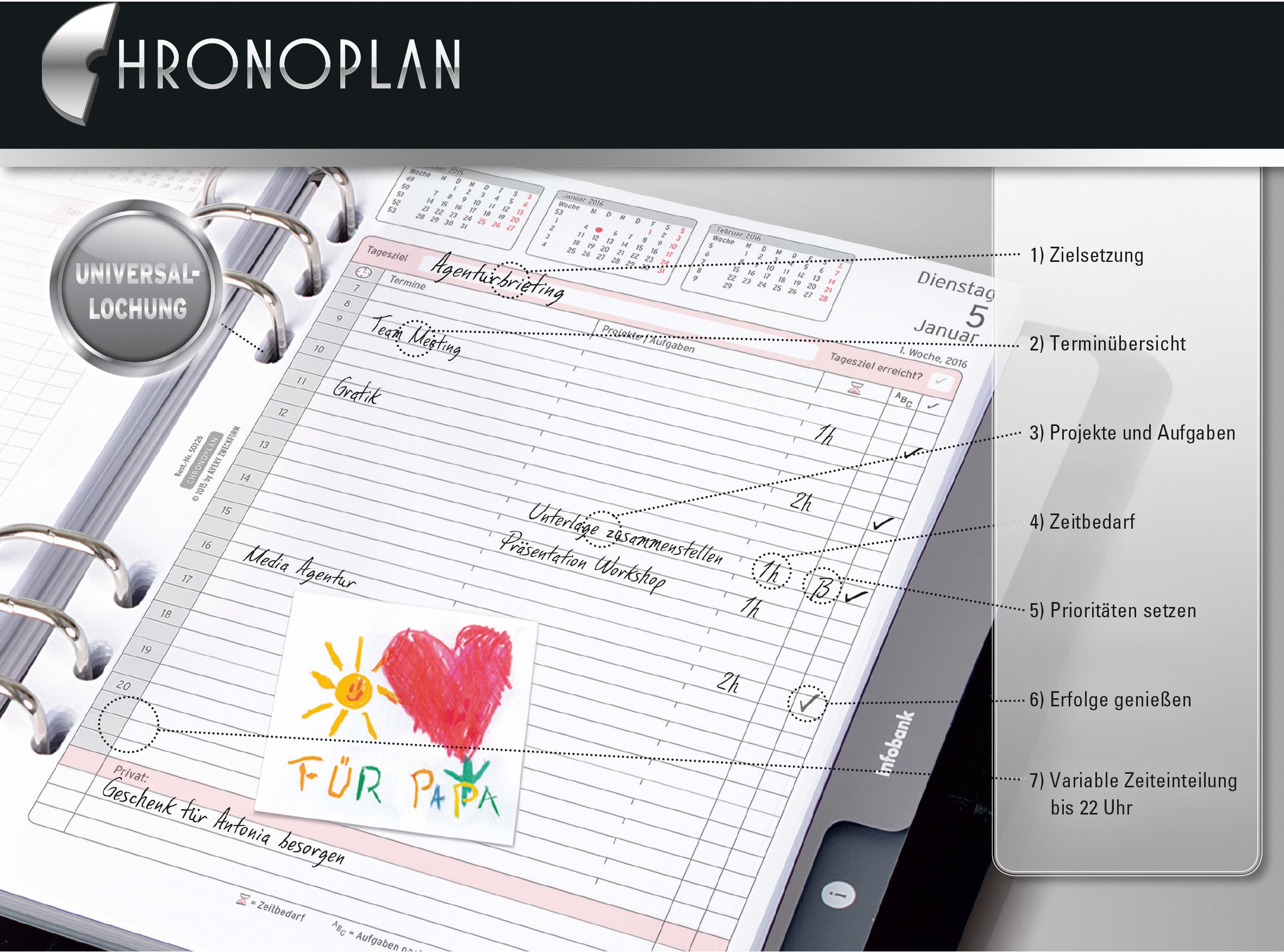 Pochette de calendrier de Chronoplan. S'adapte à tous les agendas courants grâce à la perforation universelle.