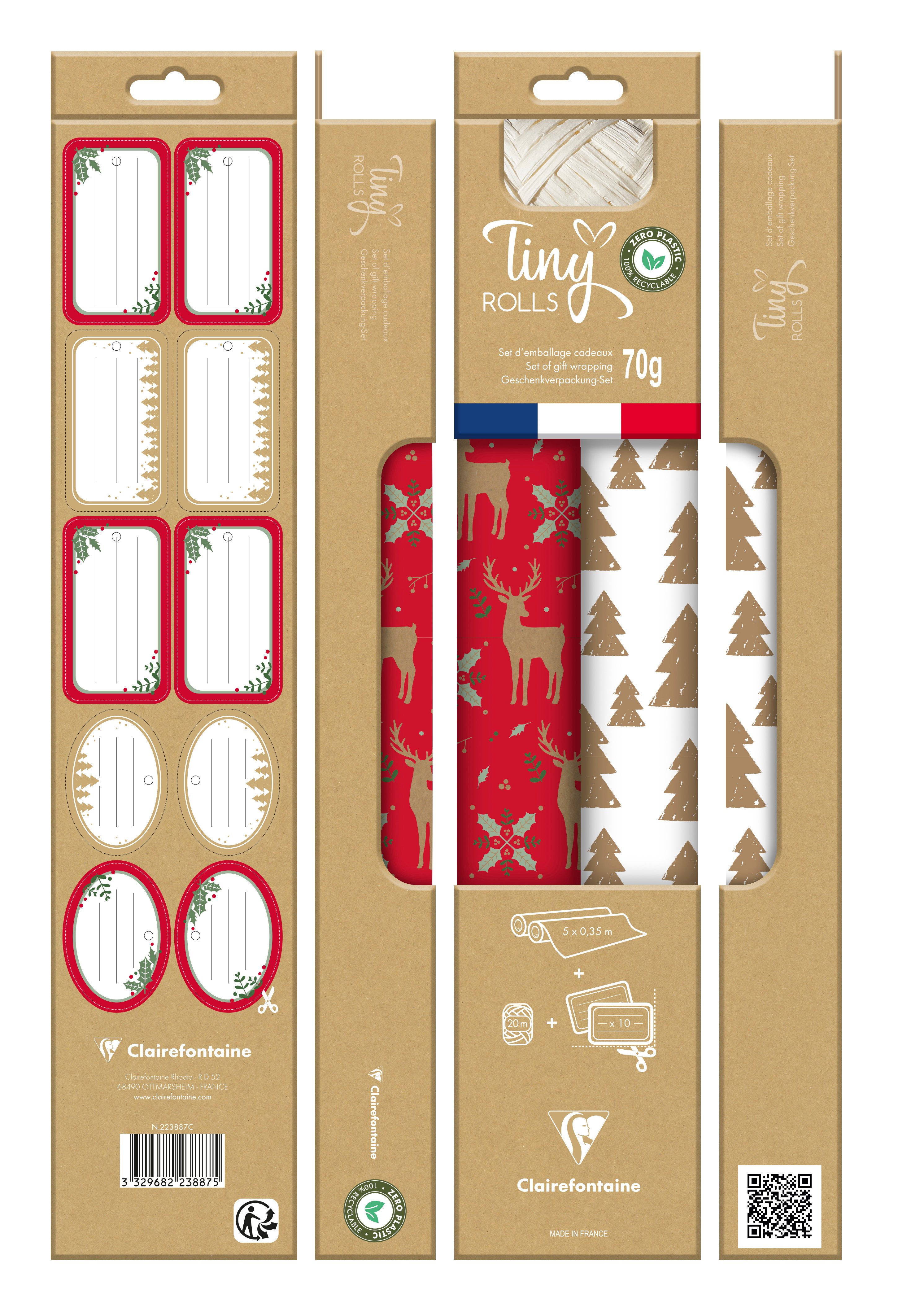 Le kit comprend : 2 rouleaux de Tiny Rolls (5x0,35 m chacun), 1 rouleau de ruban cadeau en papier (20m) et 10 étiquettes cadeaux prédécoupées qui sont intégrées au dos de l'emballage. Entièrement sans plastique et recyclables, elles peuvent être facilement détachées. Ces kits sont garantis sans plastique et préservent ainsi l'environnement.