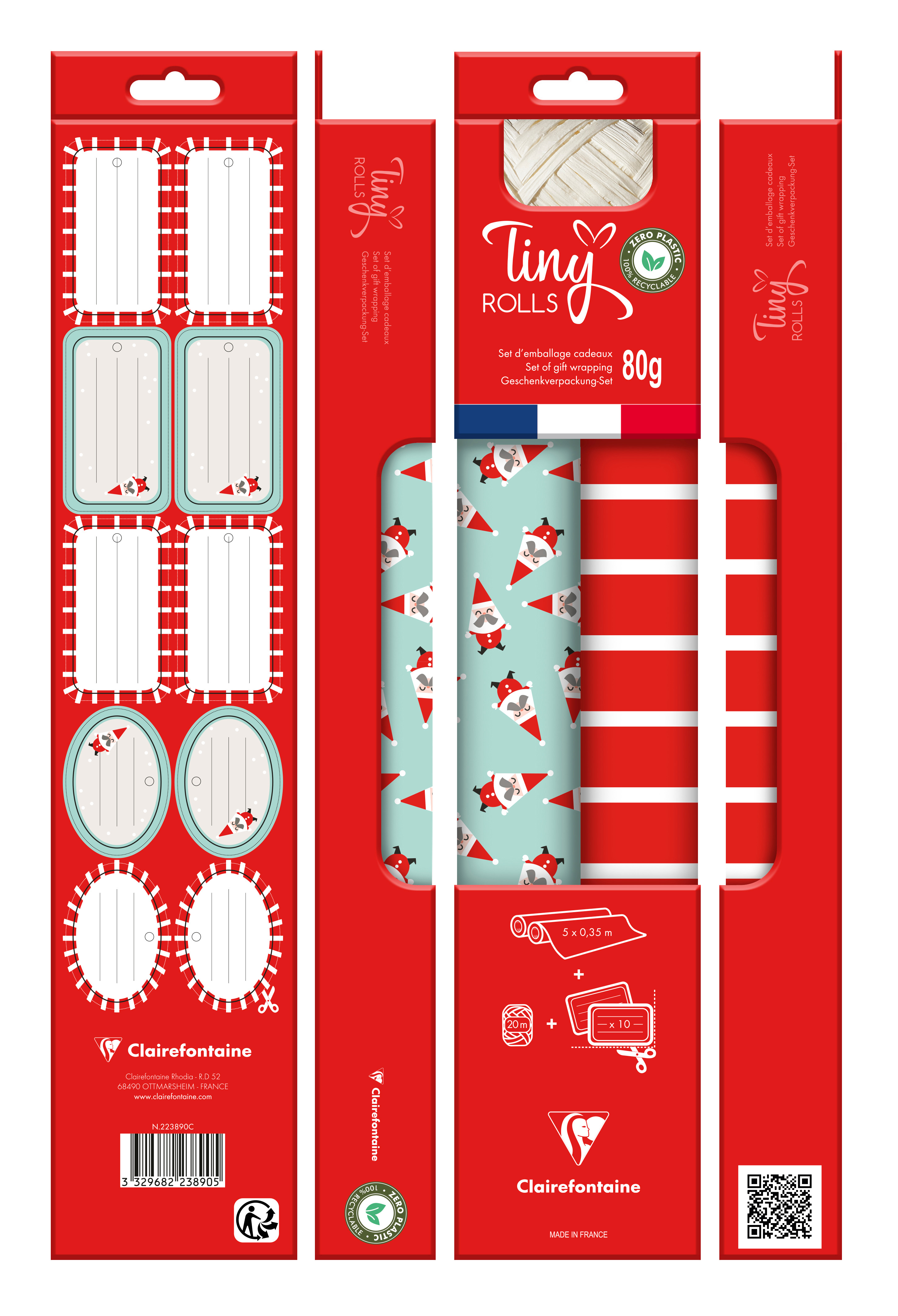 Le kit comprend : 2 rouleaux de Tiny Rolls (5x0,35 m chacun), 1 rouleau de ruban cadeau en papier (20m) et 10 étiquettes cadeaux prédécoupées qui sont intégrées au dos de l'emballage. Entièrement sans plastique et recyclables, elles peuvent être facilement détachées. Ces kits sont garantis sans plastique et préservent ainsi l'environnement.