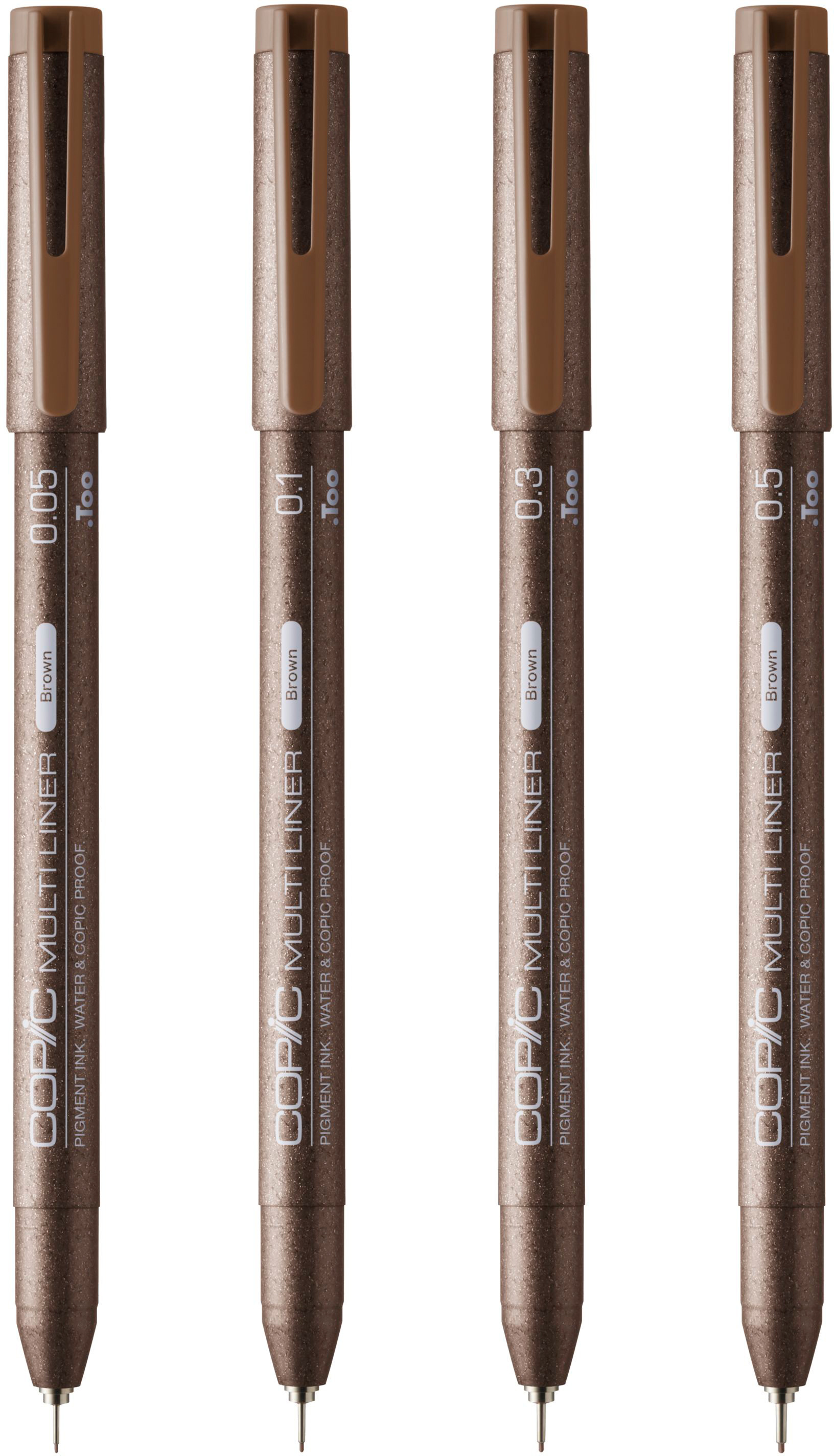 Copic Multiliner brown, 4 pièces assorties dans les épaisseurs de trait fines (0,05 mm, 0,1 mm, 0,3 + 0,5 mm.). Pour les dessins au trait, les esquisses et le traçage. Les fineliners avec une encre pigmentée résistante à l'eau ont été spécialement adaptés au système de marqueurs Copic. Les dessins préparatoires ne pâlissent pas, même après avoir été repeints plusieurs fois. Grâce à leur netteté, les lignes des Multiliners garantissent d'excellentes propriétés de reproduction, qu'elles soient utilisées avec des marqueurs ou uniquement pour des esquisses. Les dessins sont en outre résistants à la copie et à l'effacement ainsi qu'à la lumière UV.