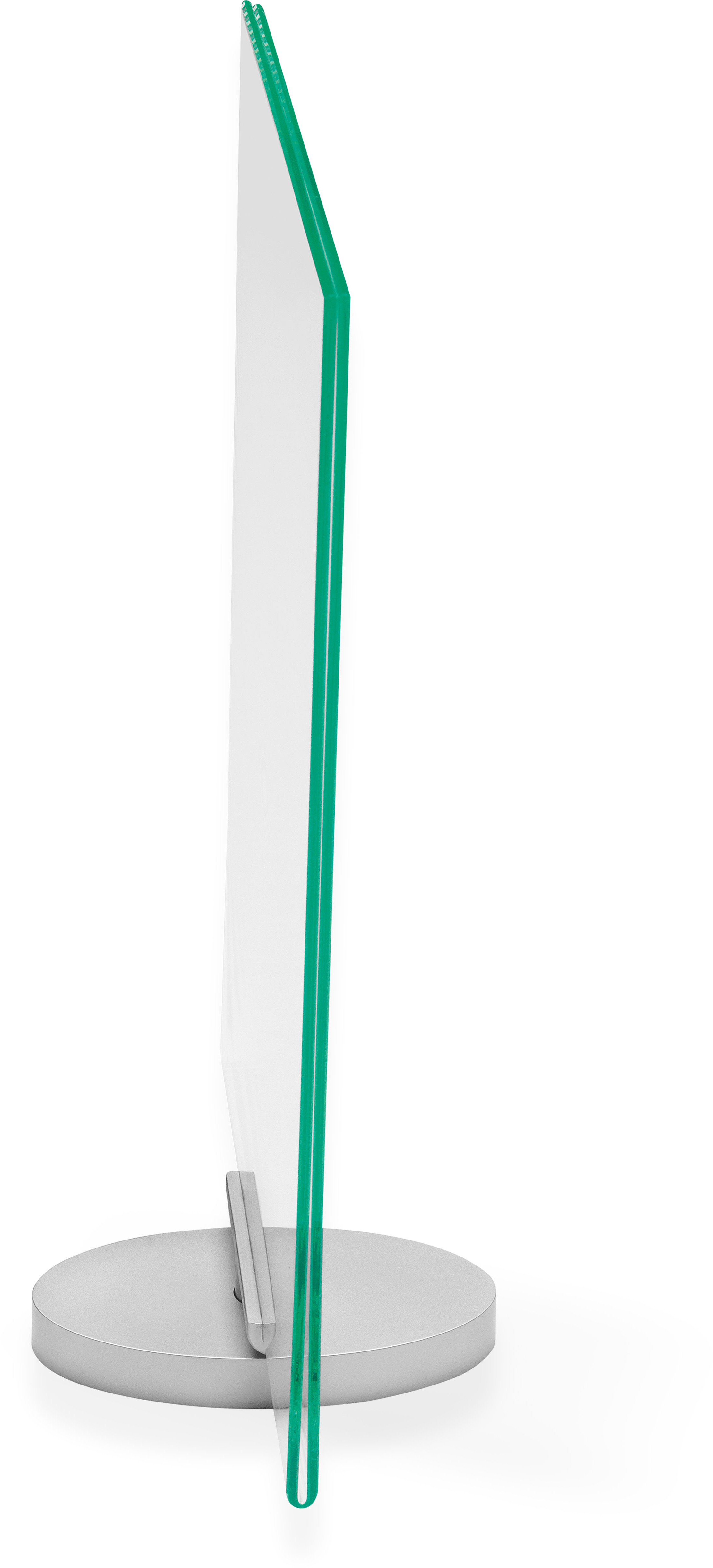 Présentoir fonctionnel pour une présentation stylée. Pivotant, avec une base élégante en argent. Pour un remplacement rapide, les inserts sont simplement glissés sur le côté du présentoir. Matériau : polystyrène.
