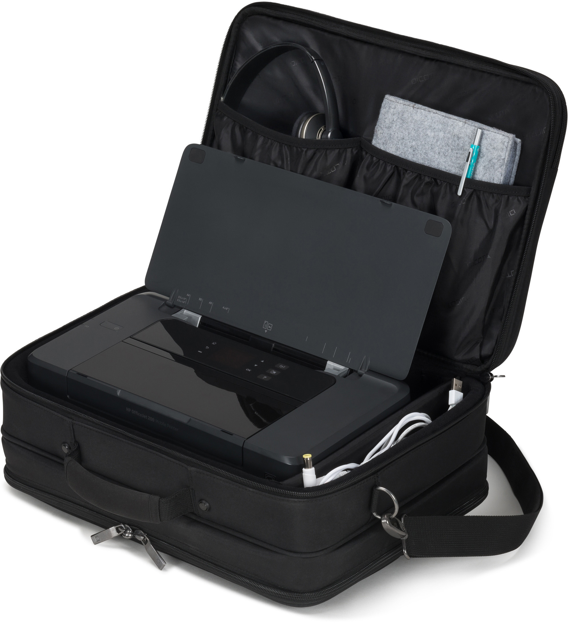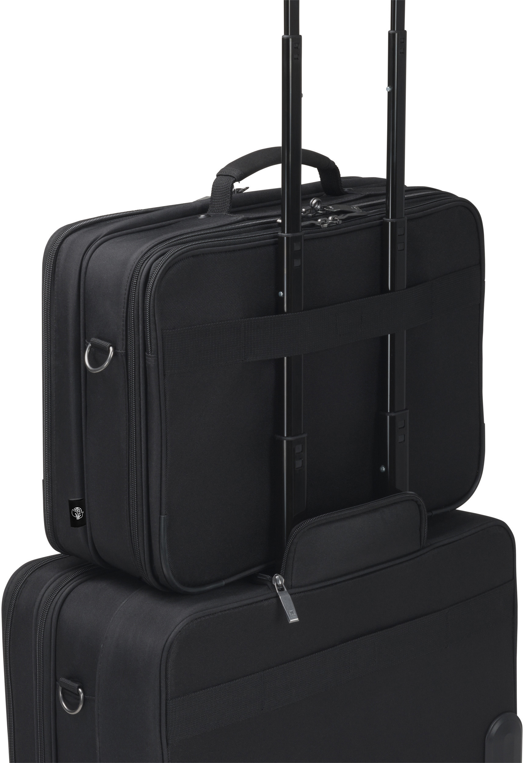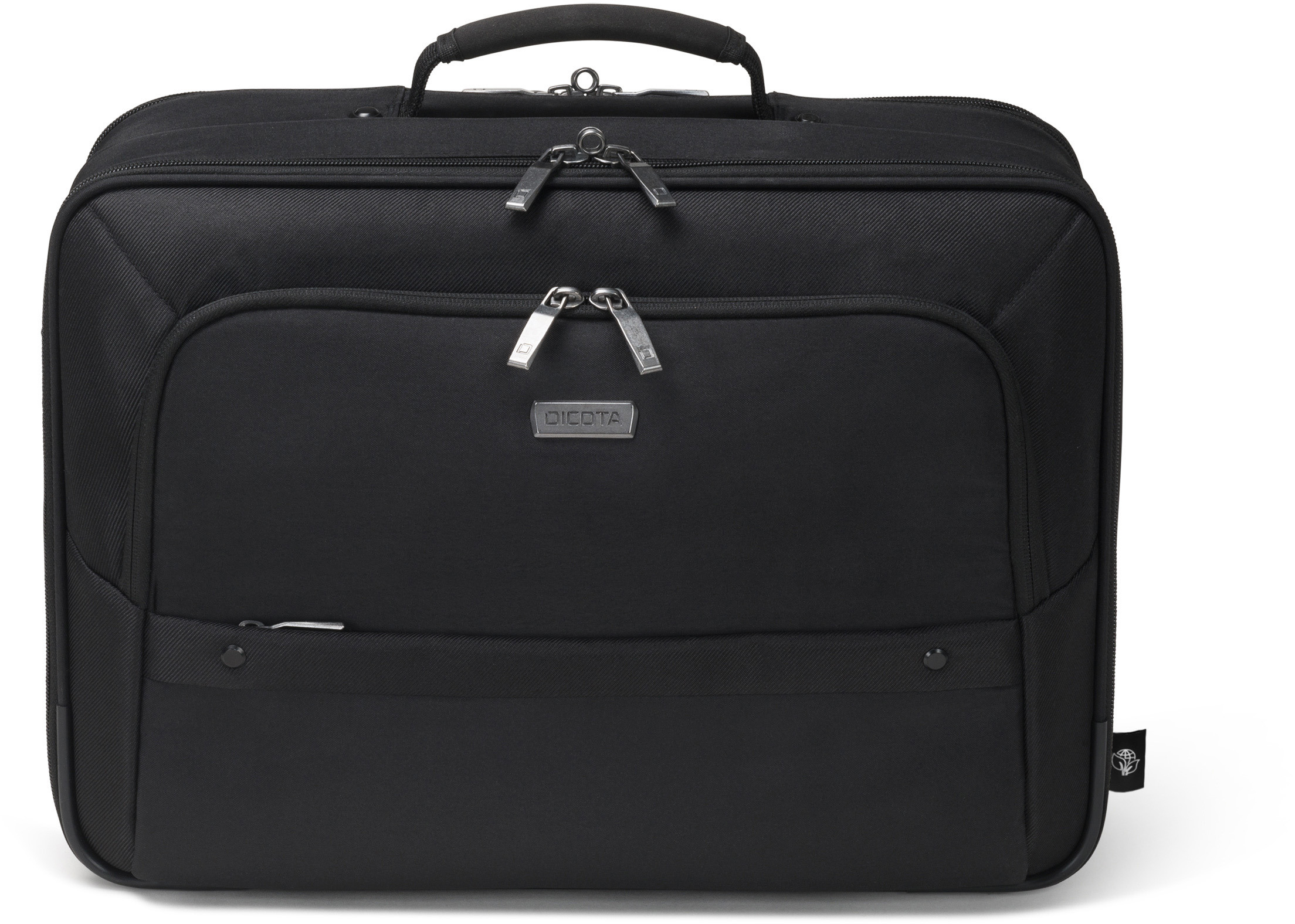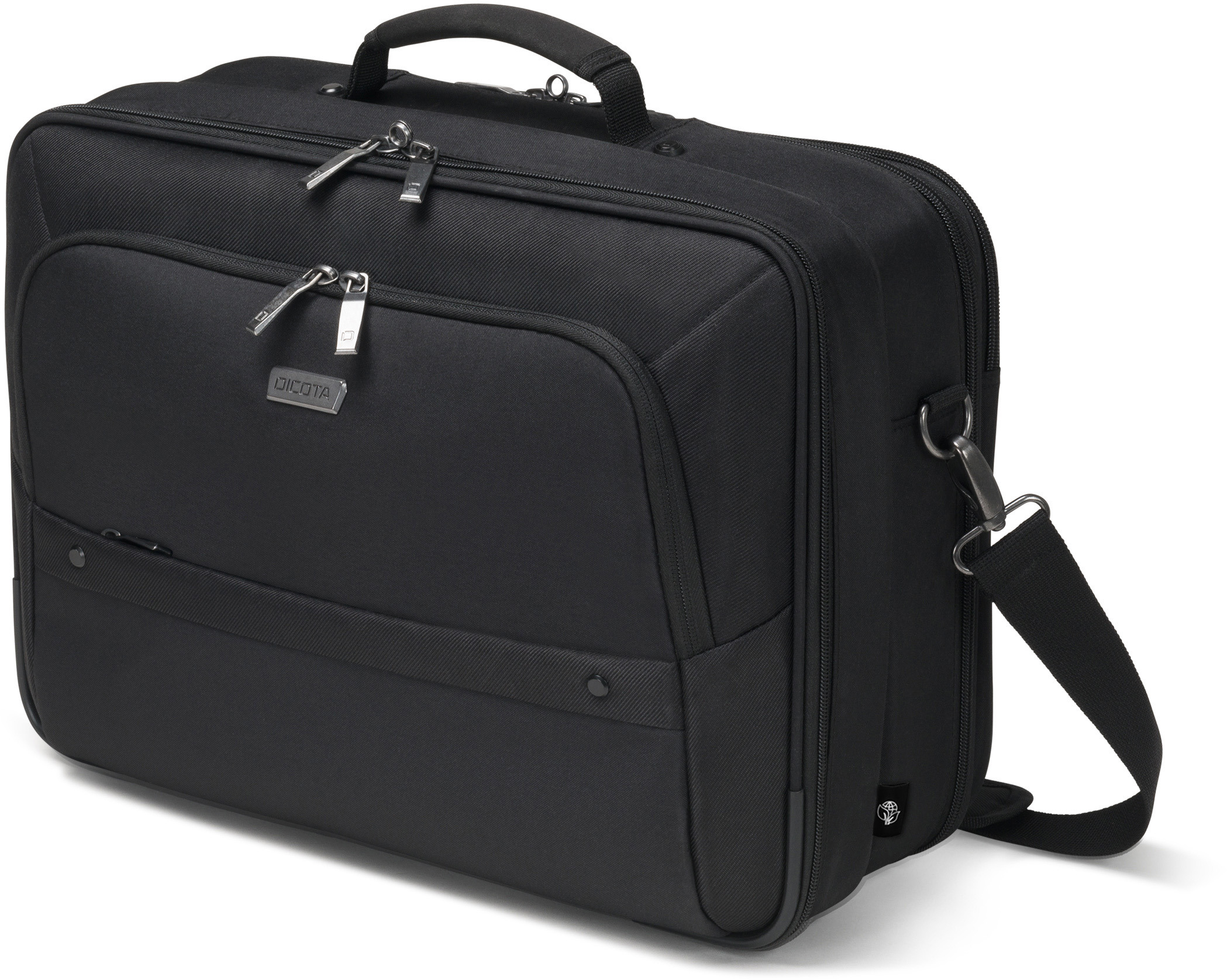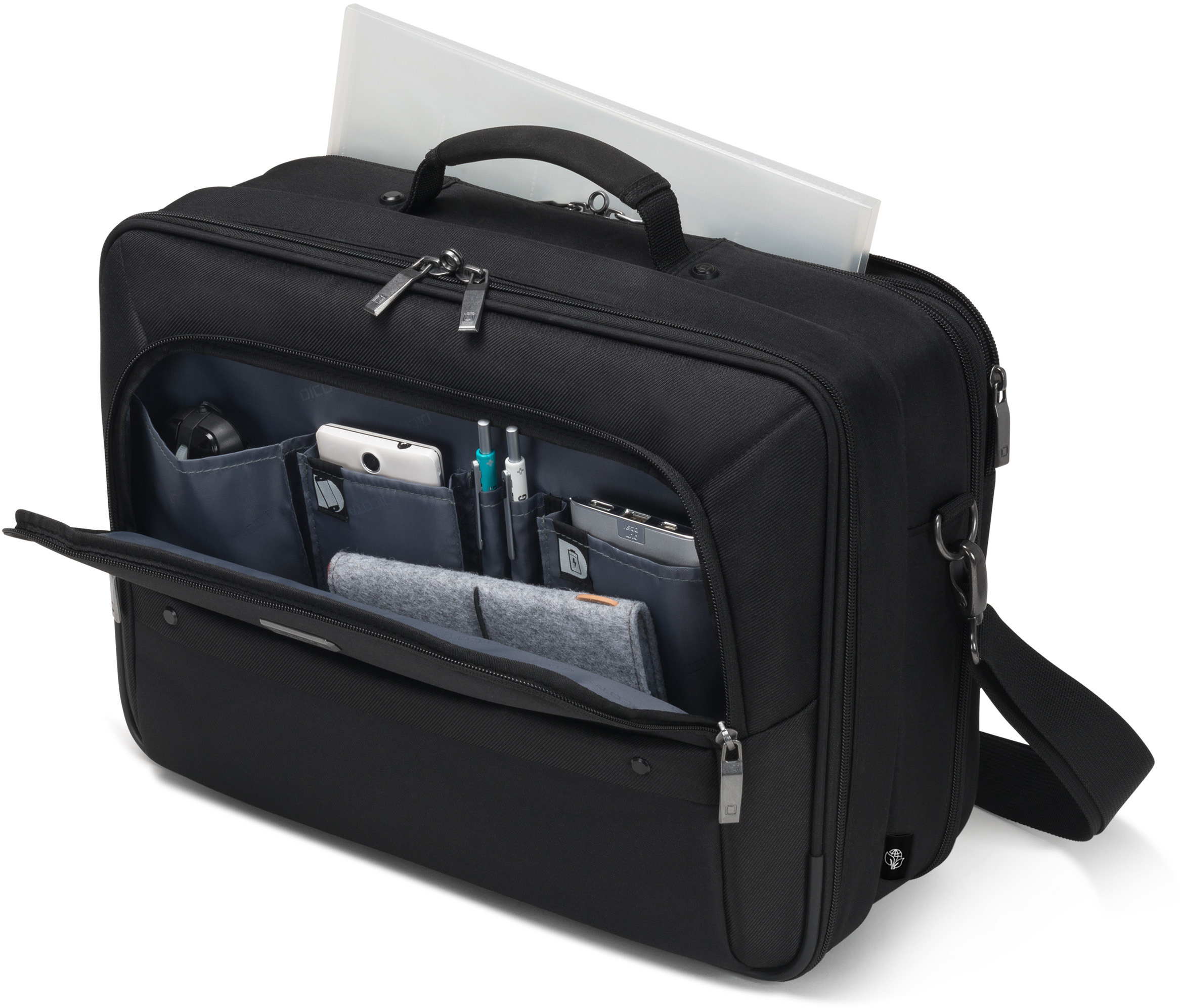 La protection du cadre en EVA, légère et particulièrement amortissante, offre une protection de premier ordre à votre appareil. Même une tablette et des accessoires trouveront leur place dans cette sacoche spacieuse et polyvalente grâce à des solutions raffinées. Dans le compartiment pour ordinateur portable, votre appareil 14-15.6" est protégé de manière optimale grâce au rembourrage en mousse haute densité (HDF) et au matériau Nylex souple ainsi qu'à la sangle de fixation élastique. Votre tablette jusqu'à 12.9" est également bien rangée dans le compartiment rembourré. Le compartiment principal verrouillable offre suffisamment d'espace de rangement pour l'imprimante et le projecteur. La spacieuse poche frontale permet de mettre de l'ordre grâce à une subdivision fonctionnelle pour le smartphone, la banque d'énergie, les stylos et autres accessoires. Une poche frontale supplémentaire permet de ranger le bloc d'alimentation et les câbles. Les documents peuvent être rangés dans la poche zippée à l'arrière. Les bretelles réglables et rembourrées, la sangle de fixation pour trolley au dos et le système intelligent de gestion interne des câbles offrent un confort parfait en voyage. L'Eco Multi Twin SELECT est donc parfait pour tous ceux qui voyagent beaucoup et qui souhaitent soutenir la réutilisation judicieuse des bouteilles en PET avec une solution de transport écologique.