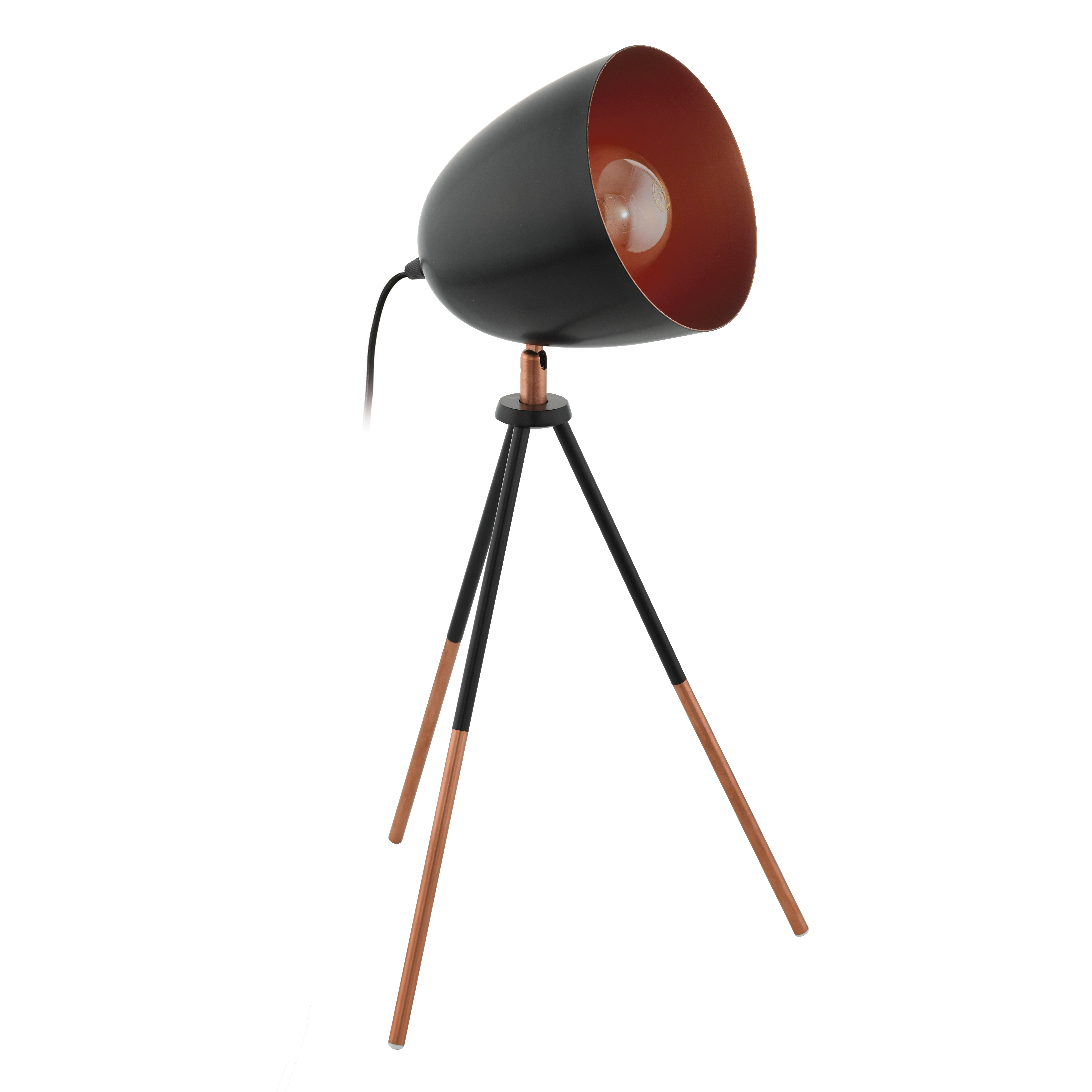 Die Tischleuchte CHESTER besteht aus einem dreibeinigen Lampenfuss aus schwarzem Metall, der im unteren Bereich in Kupferfarben gestaltet ist. Kombiniert wurde der Fuss mit einem runden, schwenkbaren Metall-Lampenkopf in Schwarz und einer kupferfarbenen Innenseite. Ein bequemes Ein- und Ausschalten der Leuchte ist über einen Kabelschalter möglich. Die Tischlampe im modernen Design bietet eine wohnliche Beleuchtung für jeden Raum – egal ob im Schlafzimmer, Wohnzimmer oder Büro bzw. Arbeitszimmer. Das abgebildete Filament-Leuchtmittel ist nicht im Lieferumfang enthalten. Geeignet ist die Leuchte für jedes Leuchtmittel mit E27-Sockel.