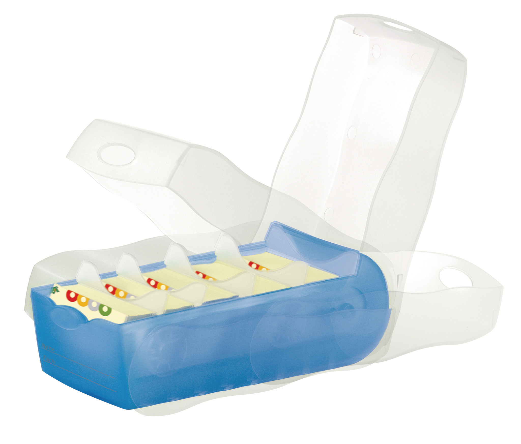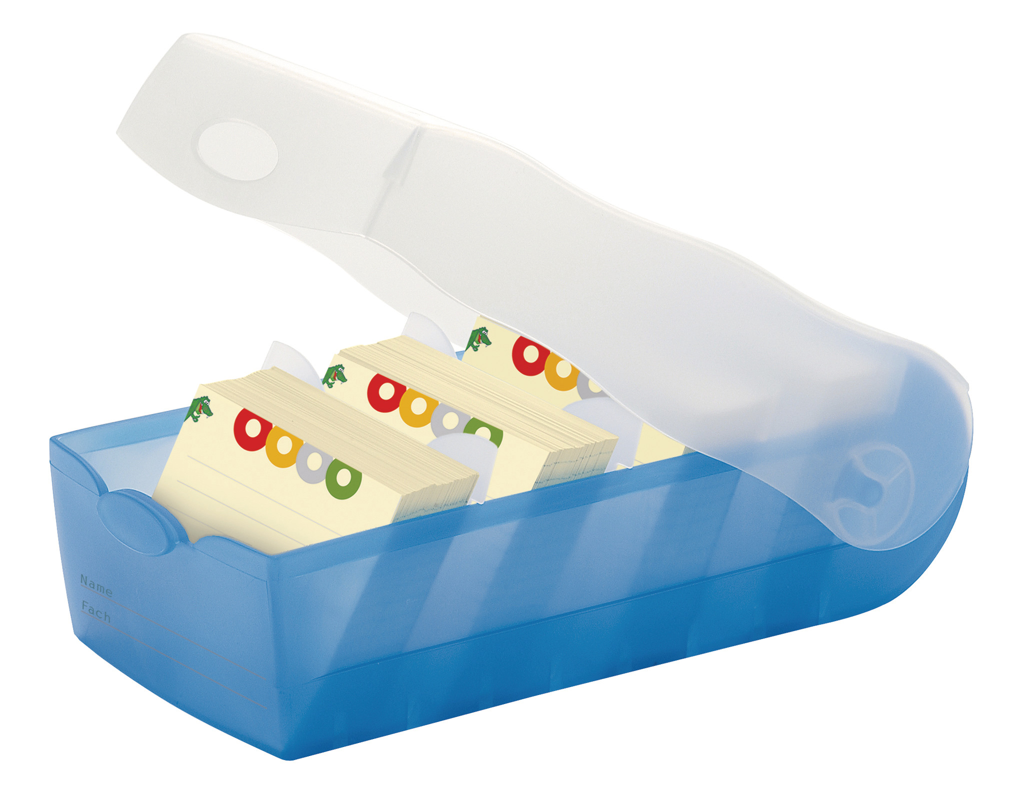 Boîte d'apprentissage pour téléphone et fiches Croco A7 - A l'ouverture, le couvercle disparaît sous la boîte, à l'état fermé, les supports sont bloqués - 100 fiches lignées incluses - 5 plaques de support variables et grande étiquette d'inscription - Contient jusqu'à 900 fiches - 100 fiches lignées incluses