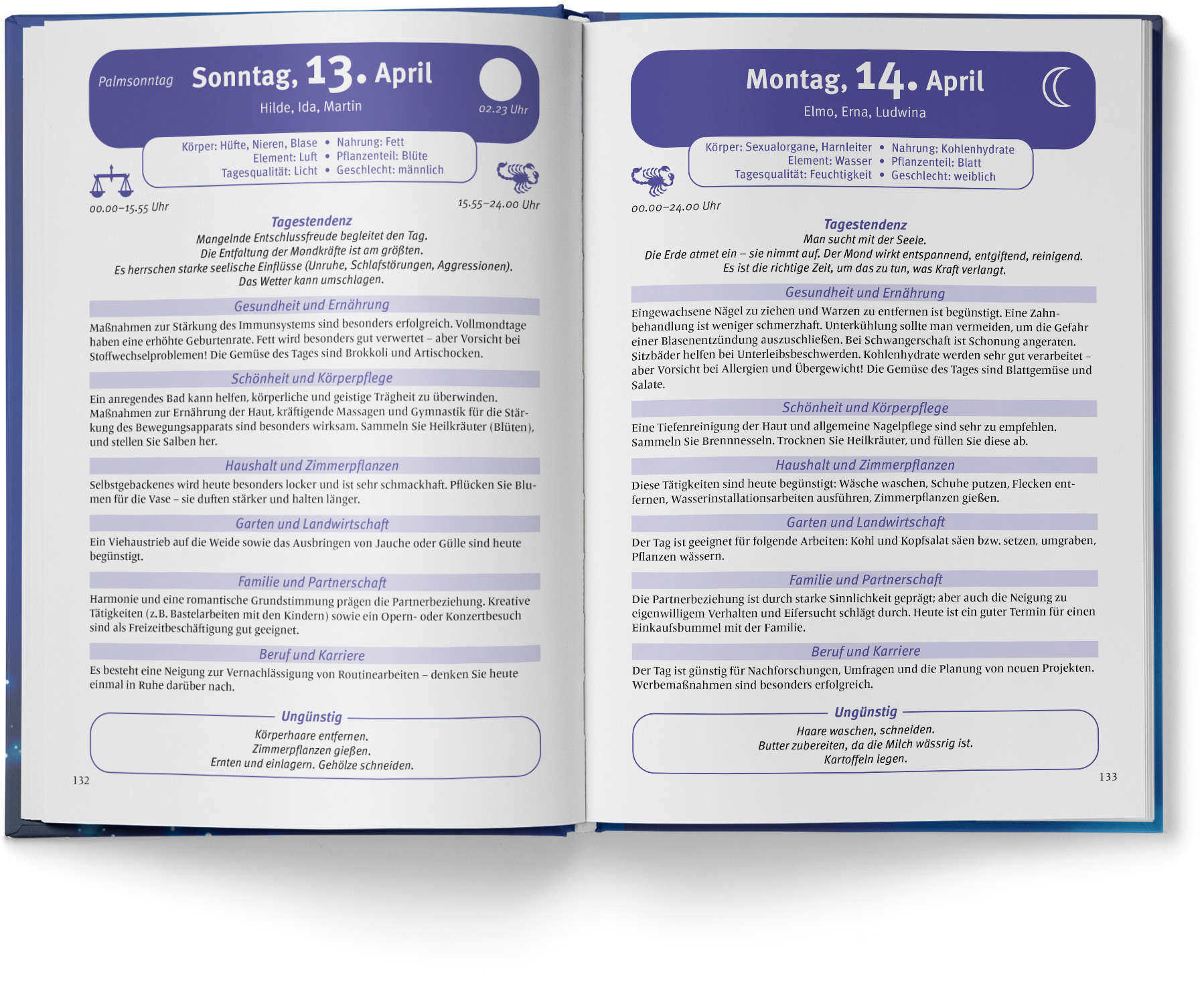 Grand, relié, lourd - le livre-calendrier Föger détaillé. Sur 448 pages, vous apprendrez tout ce qu'il faut savoir sur la lune et ses influences sur la vie terrestre - qu'il s'agisse du trésor de connaissances de nos ancêtres ou de connaissances scientifiques désormais bien établies. Des aperçus mensuels complets et des informations quotidiennes en pleine page sur des thèmes allant de la santé aux soins de beauté, du ménage à la culture des plantes et de la vie privée à la vie professionnelle vous montrent comment utiliser les influences lunaires dans votre vie quotidienne. Plus les deux suppléments spéciaux à détacher : - Journal lunaire pour noter vos expériences personnelles avec les forces de la lune - Planificateur lunaire, très grand au format 42,0 x 29,8 cm