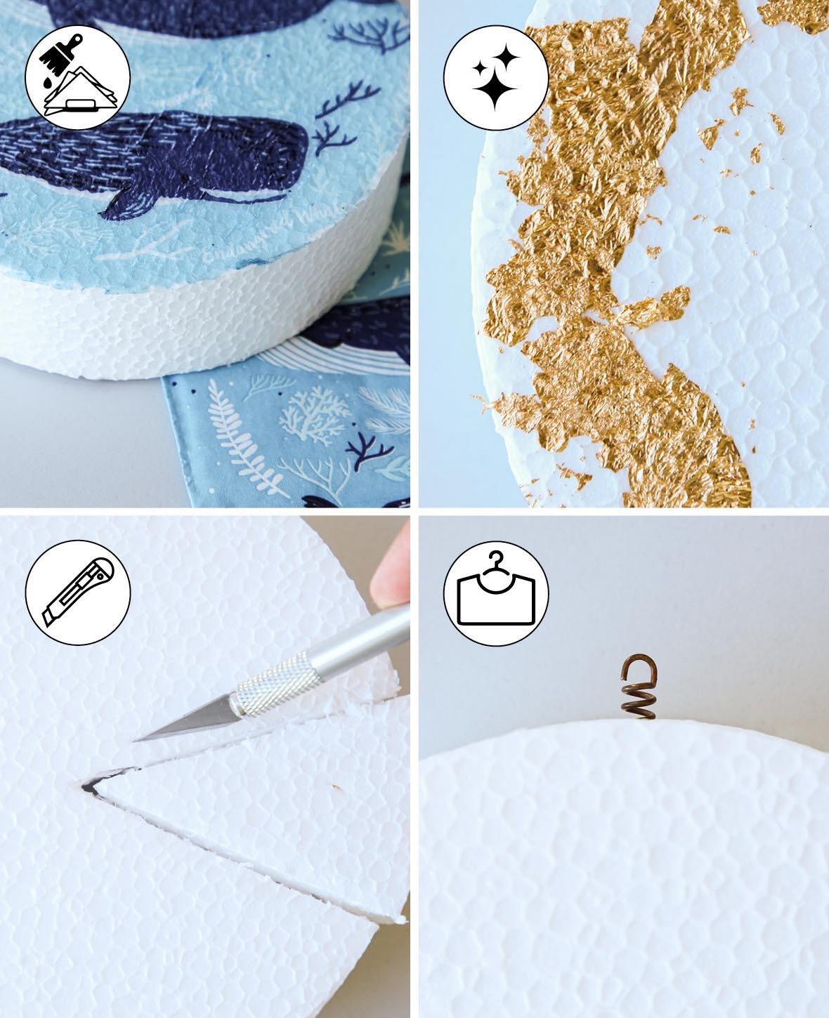 Le polystyrène est un matériau de base idéal pour divers travaux de bricolage. Il peut être travaillé de différentes manières, par exemple peint, collé, travaillé avec la technique des serviettes et des paillettes ou utilisé comme base pour des œuvres d'art en mosaïque. Le polystyrène est également un support parfait pour les pâtes de structure. Lors de la peinture et de la pulvérisation, il est recommandé, en fonction de la couleur choisie, d'appliquer d'abord une couche de fond, car la peinture risque sinon de ronger le polystyrène. Pour coller avec de la colle chaude, il faut en outre choisir un pistolet à colle à basse température.