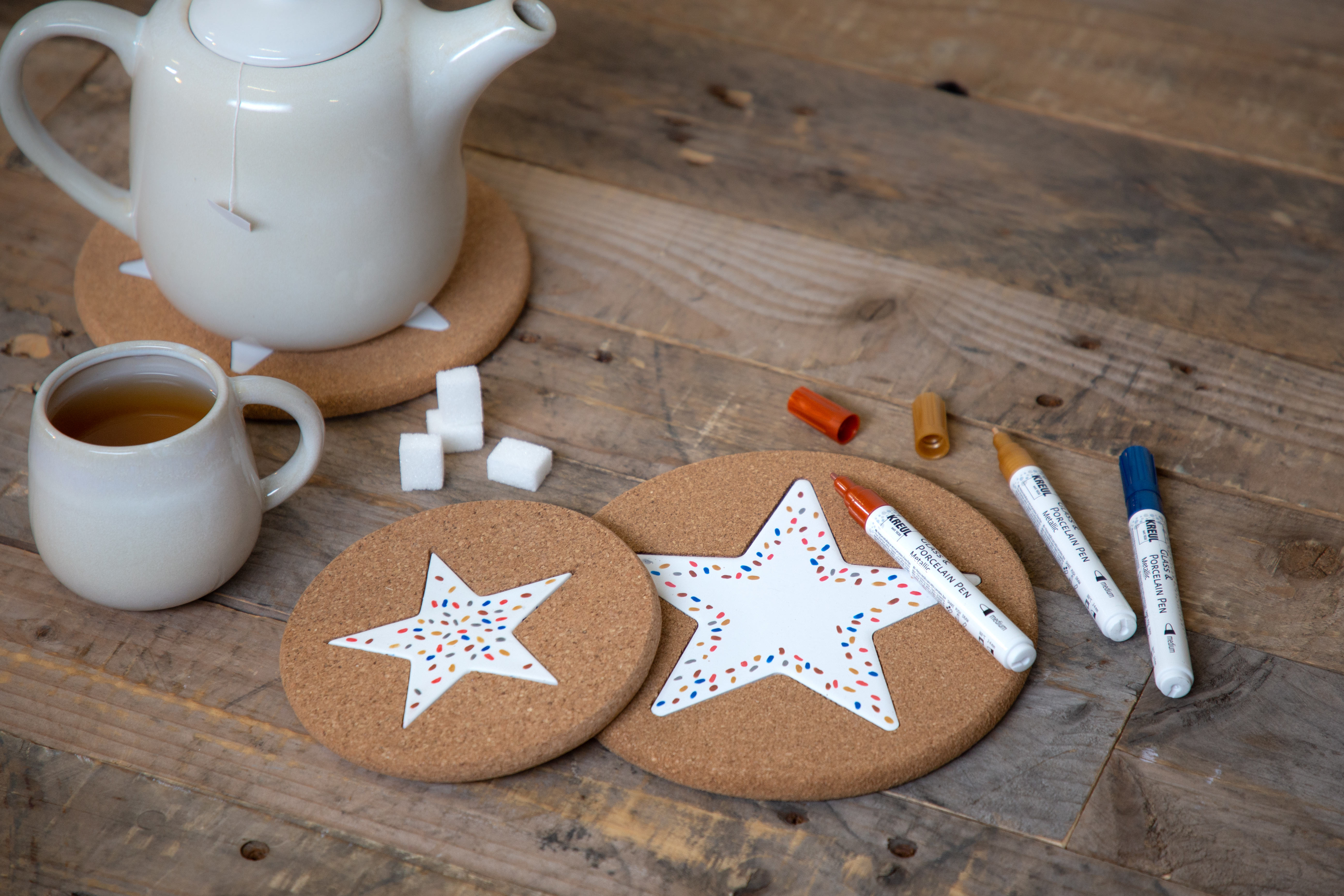Die Korkuntersetzer können mit unterschiedlichen Techniken verschönert werden. Die Porzellanplatte in der Mitte lässt sich entfernen, z.B. für das Einbrennen der Porzellanfarbe im Backofen oder dem Reinigen. Es kann leicht mit Porzellan- und Glasfarben bemalt und verschönert werden und ist somit eine praktische DIY-Geschenkidee.