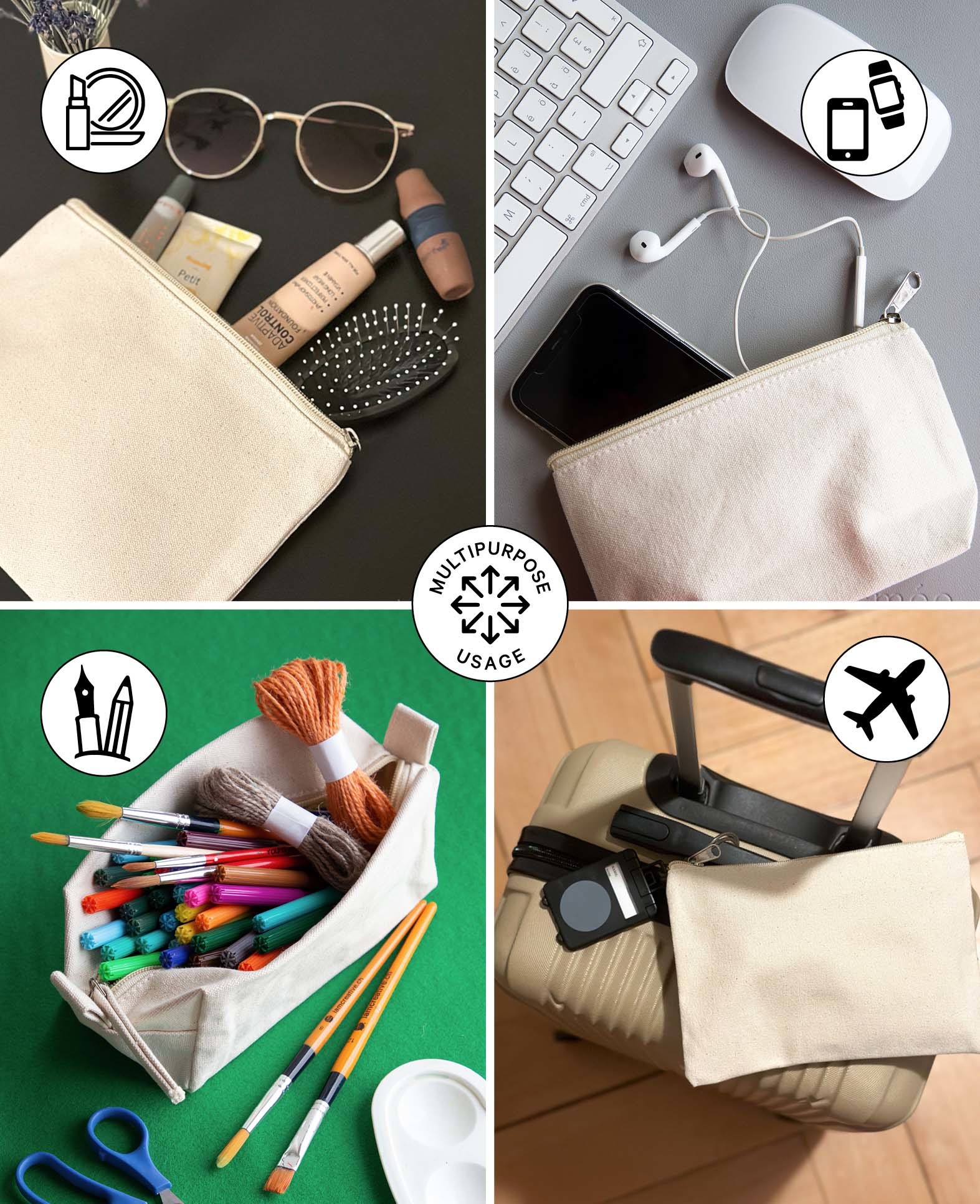 Les textiles permettent de réaliser de nombreuses et magnifiques idées créatives. Que l'on imprime le tissu avec un tampon fait maison, que l'on laisse les petits enfants peindre avec de la peinture pour textile ou que l'on décore avec d'autres matériaux comme le liège, les résultats sont à chaque fois convaincants. Découvre les possibilités illimitées que t'offrent les textiles ! Cette trousse de toilette forte, robuste et pratique au style classique est un compagnon indispensable pour chaque voyage. Elle offre de la place pour de nombreux produits cosmétiques et est fabriquée en coton de haute qualité. La trousse de toilette de voyage avec fermeture éclair dispose de deux passants pratiques qui facilitent le transport et permettent ainsi d'avoir toujours tout à portée de main. Remarque : prélaver les textiles sans adoucissant avant la première application de peinture.