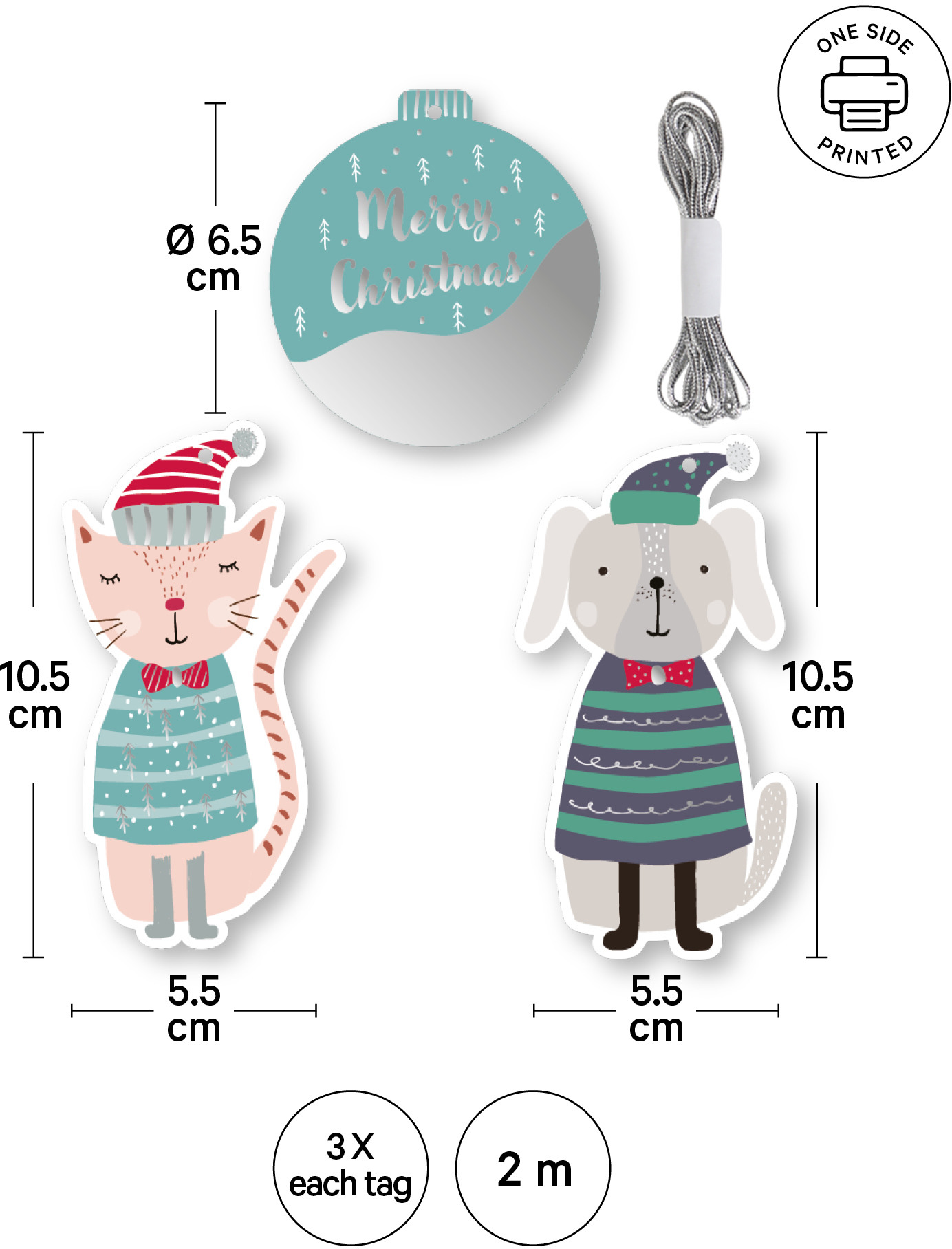 Avec une étiquette cadeau, tu peux décorer un emballage cadeau avec style et faire plaisir à celui ou celle à qui tu l'offres. Le set comprend une ficelle adaptée pour la fixation sur les cadeaux. 3x boule : 7 x 6.5 cm / 3x chat : 10.5 x 5.5 cm / 3x chien : 10.5 x 5.5 cm
