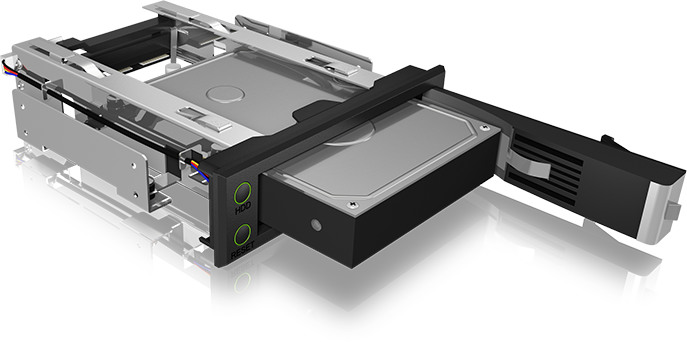 Avec ce cadre amovible sans support pour disques durs, aucun outil ni vis n'est nécessaire pour installer les disques durs. Une fois installé dans une baie 5,25" libre, il suffit d'ouvrir le volet frontal, d'insérer le disque dur et de refermer le volet. C'est terminé. Le verrou protège contre le retrait non autorisé du support de données et les deux anneaux LED ne sont pas seulement élégants, mais informent également l'utilisateur intéressé sur l'état du disque dur. La connexion brevetée NSS (Non-Scratch-SATA) est conçue pour plus de 50.000 changements de disques durs. À raison de quatre à cinq changements par jour, cela correspond à une durée de vie d'environ 50 années de travail. Le boîtier spécial en aluminium n'a pas besoin de ventilateur et les rembourrages en caoutchouc intégrés évitent les vibrations et les bruits du support de données.