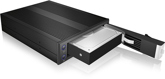 Le cadre amovible est monté dans une baie standard de 5,25" et offre de la place pour un disque dur SATA de 3,5". Les données peuvent être transférées à une vitesse allant jusqu'à 6 Gbit/s via un connecteur NSS (No-Scratch-SATA) de qualité (SATA I, II, III). Le boîtier est entièrement en aluminium spécial, ce qui assure un meilleur refroidissement et permet un fonctionnement stable du disque dur, même sans ventilateur. Le disque dur peut être remplacé facilement à l'aide de Hot Swap et Plug & Play, mais le boîtier est également verrouillable afin d'empêcher l'accès aux personnes non autorisées. Une LED indique simultanément le fonctionnement (alimentation électrique) et l'accès (lecture/écriture).