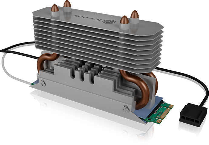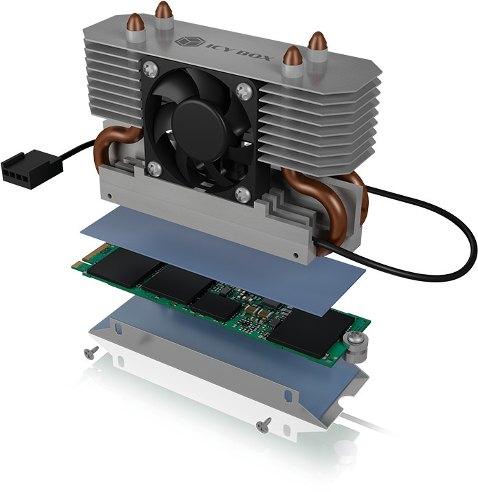 Le IB-M2HSF-702 est un refroidisseur M.2 à caloducs haute performance avec ventilateur intégré. Grâce à la technologie des caloducs, le refroidisseur peut réduire la température de votre disque SSD M.2 NVMe jusqu'à 50% et assure ainsi des performances stables et durables dans votre processus de travail. Le ventilateur veille à ce que la chaleur soit évacuée de manière idéale.