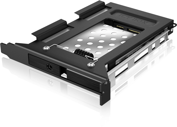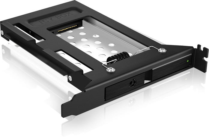 Dans ce cas, ce cadre amovible pourrait éventuellement être la solution adéquate. Il offre de la place pour un disque dur ou un disque SSD de 2,5" et s'installe à l'arrière de l'ordinateur dans un emplacement pour cartes d'extension. Les disques durs peuvent avoir une hauteur maximale de 9,5 mm. Grâce à Easy Swap® et Plug and Play, les disques durs peuvent être facilement remplacés et mis en service, car ils ne nécessitent ni outils ni vis. Une LED indique si le disque dur est alimenté et s'il est en cours d'utilisation. L'interface SATA est compatible SATA I, II et III, ce qui signifie que des taux de transfert allant jusqu'à 6 Gbit/s sont possibles. Cela rend l'utilisation d'un SSD à la place d'un HDD particulièrement attractive, car les HDD sont physiquement limités en vitesse par leurs composants mécaniques.