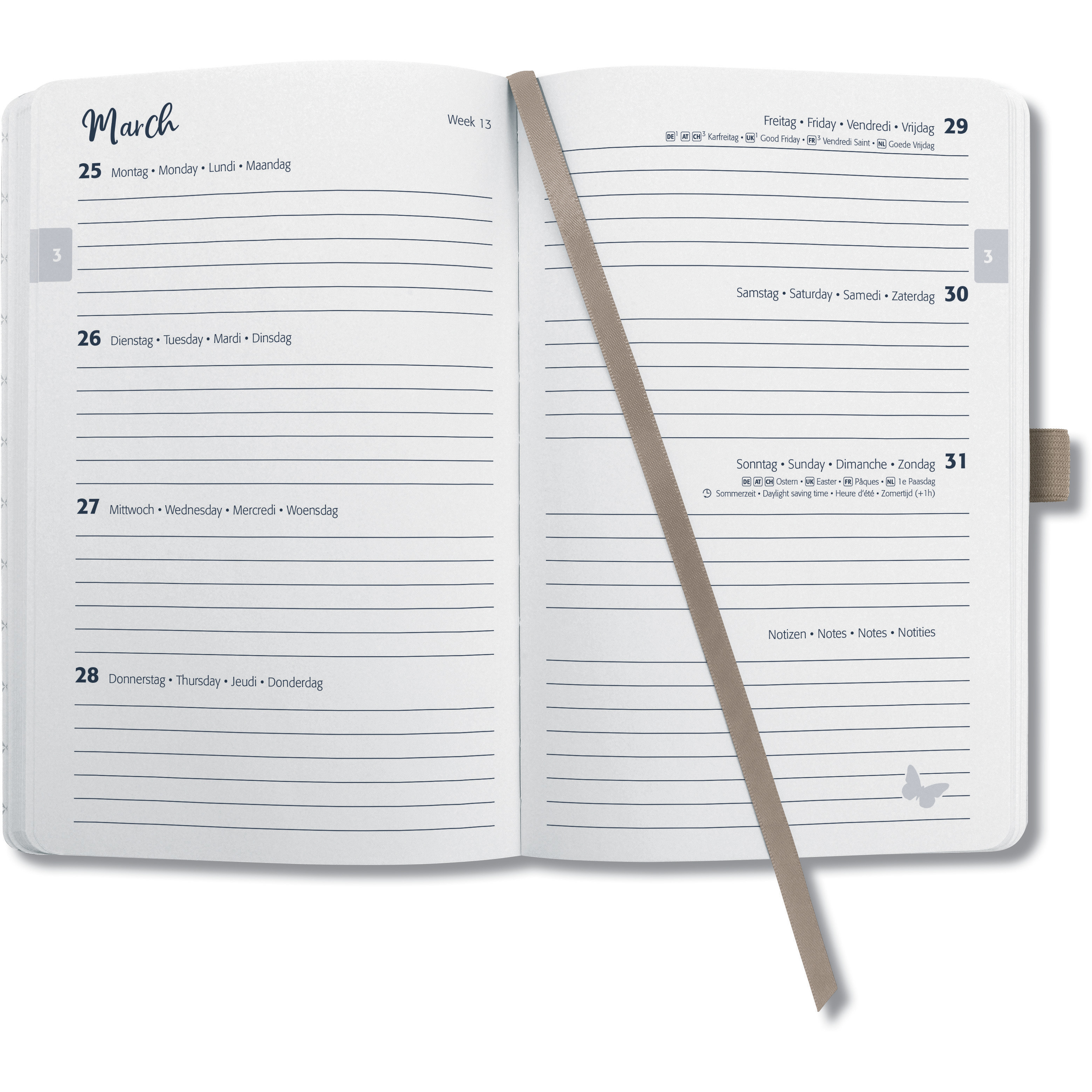 L'agenda semainier Jolie à couverture rigide en PU souple avec un design en relief contient 174 pages, y compris des pages de notes (12 feuilles perforées à détacher). Le calendrier présente une semaine sur une double page. De plus, l'agenda contient de nombreuses pages d'informations, par exemple des aperçus mensuels et annuels, des tailles de vêtements internationales, des horaires et un planning familial, de la place pour les adresses, les jours fériés, un aperçu des vacances, etc. Maintenant avec une planche d'autocollants pour organiser & personnaliser. Un index mensuel dans la marge permet de trouver rapidement les mois. L'agenda est muni d'un élastique de couleur assortie et est équipé d'un passant pour stylo, d'un ruban de lecture et d'une pochette de rangement.