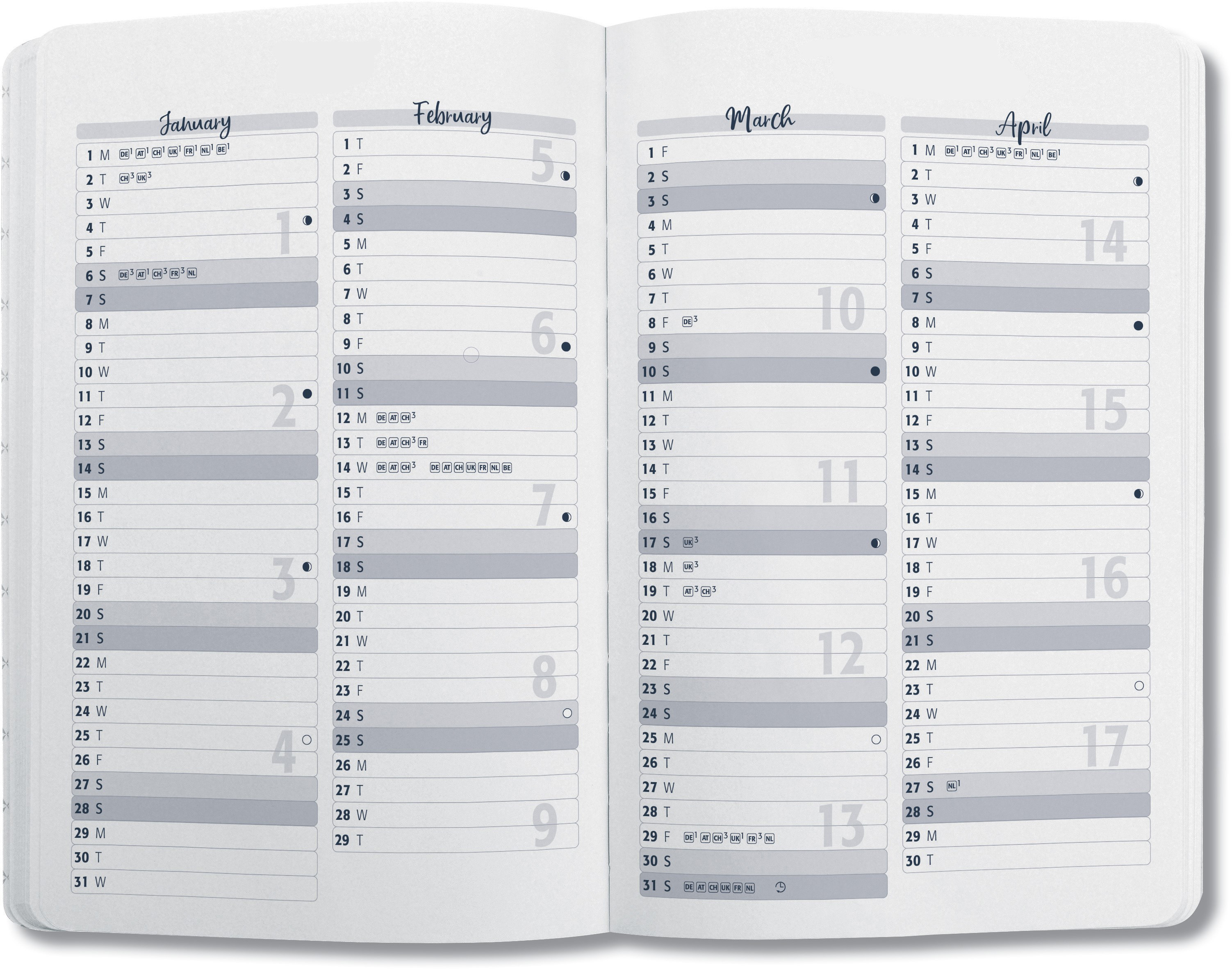 L'agenda semainier Jolie à couverture rigide en PU souple avec un design en relief contient 174 pages, y compris des pages de notes (12 feuilles perforées à détacher). Le calendrier présente une semaine sur une double page. De plus, l'agenda contient de nombreuses pages d'informations, par exemple des aperçus mensuels et annuels, des tailles de vêtements internationales, des horaires et un planning familial, de la place pour les adresses, les jours fériés, un aperçu des vacances, etc. Maintenant avec une planche d'autocollants pour organiser & personnaliser. Un index mensuel dans la marge permet de trouver rapidement les mois. L'agenda est muni d'un élastique de couleur assortie et est équipé d'un passant pour stylo, d'un ruban de lecture et d'une pochette de rangement.