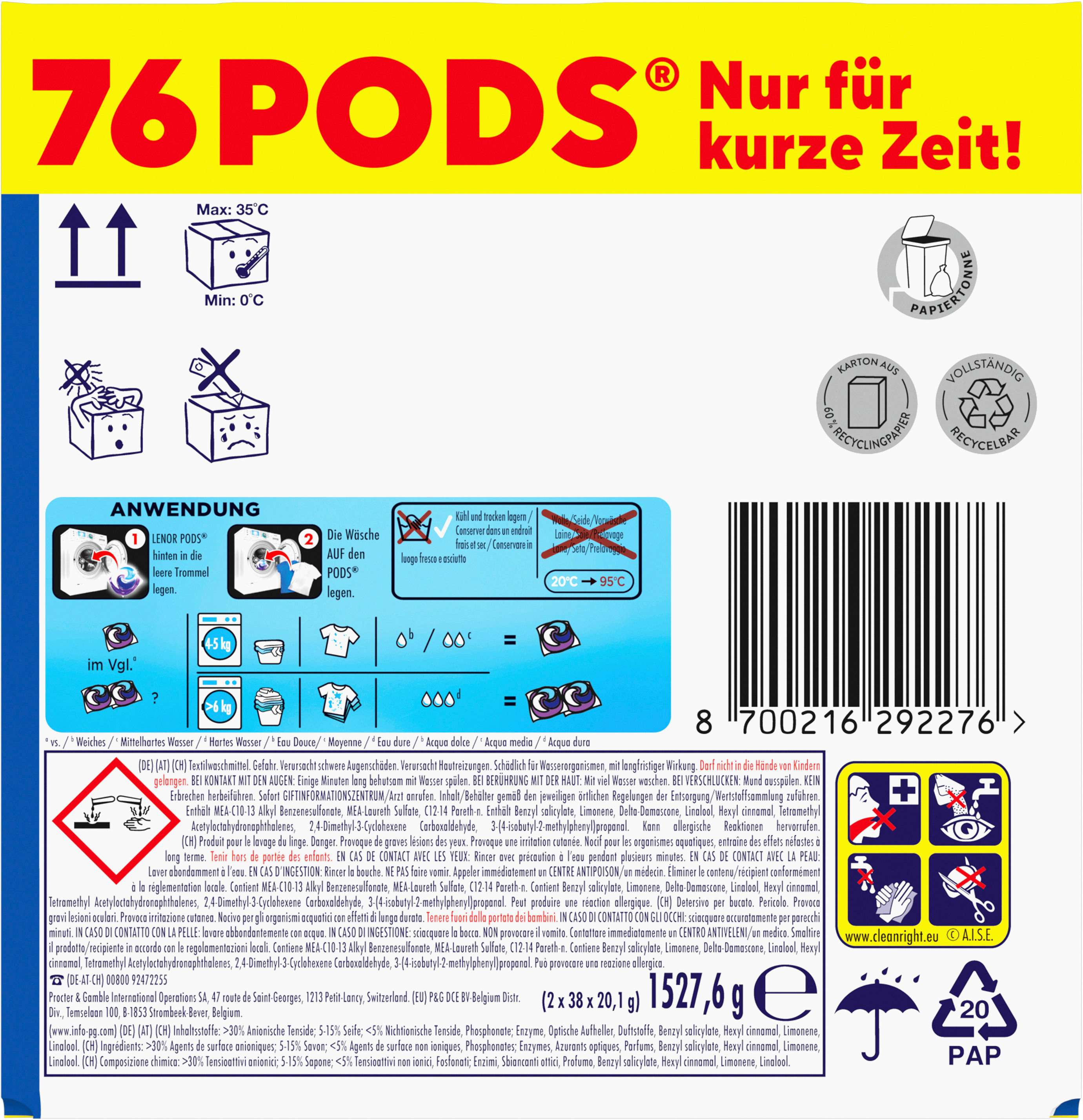 - DURABLE : L'emballage des sachets Lenor Pods est recyclable.