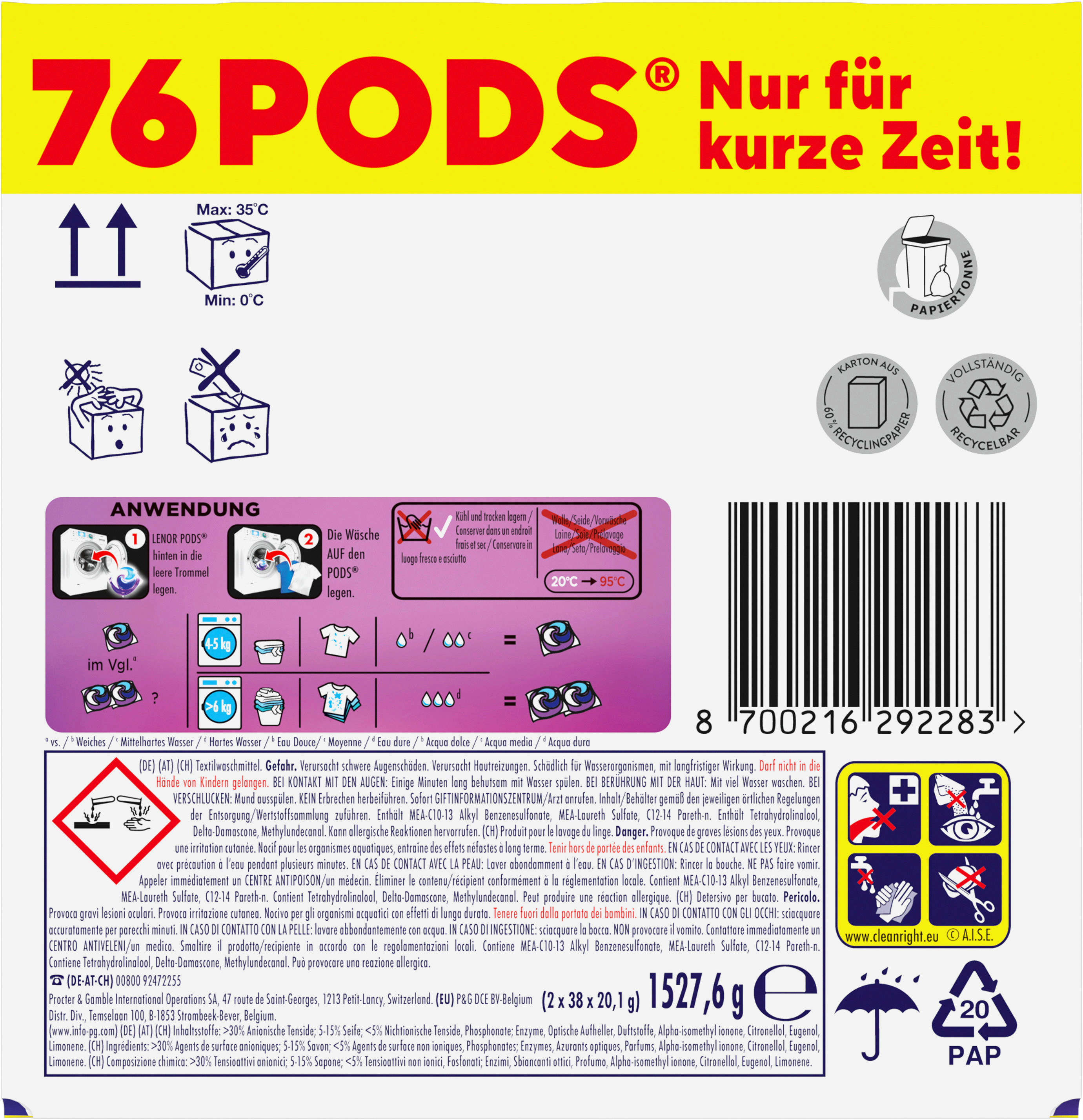 - DURABLE : L'emballage des sachets Lenor Pods est recyclable.