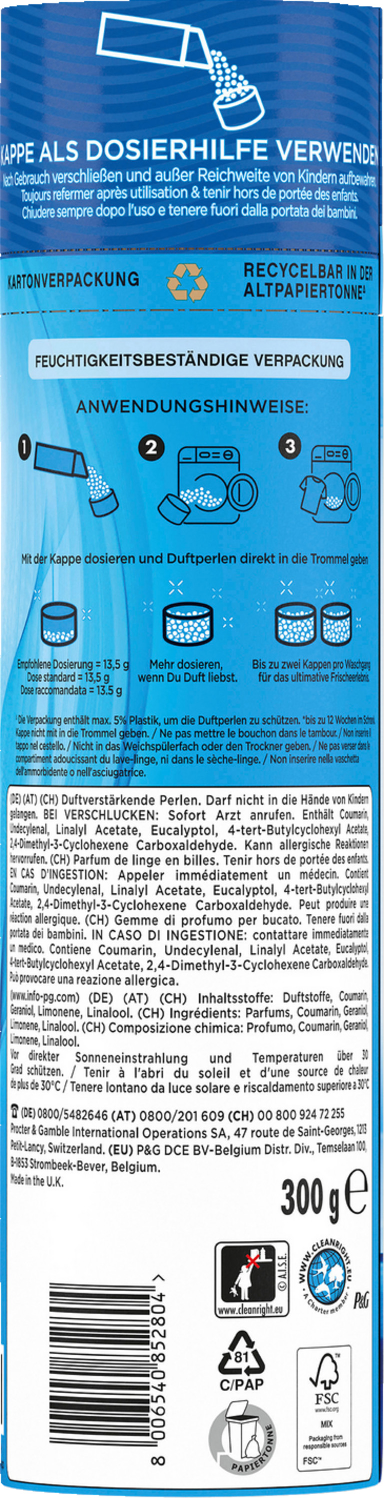 Découvrez le parfum pour le linge Lenor pour une touche de fraîcheur non-stop sur votre linge. Lenor donne un parfum frais à vos vêtements dans l'armoire pendant jusqu'à 12 semaines. Il suffit de le verser directement dans le tambour à chaque lavage et de le doser selon l'intensité de parfum souhaitée. Le parfum Fraîcheur d'avril s'inspire de notes chyprées classiques avec de la bergamote rafraîchissante et procure de l'énergie et une sensation de fraîcheur totale. Utilisez Lenor Parfum pour le linge avec la lessive et l'adoucissant Lenor correspondants pour une propreté, une douceur et une fraîcheur éclatantes. Le Parfum pour le linge Lenor est disponible dans un emballage en carton résistant à l'humidité, qui peut être recyclé après utilisation avec les vieux papiers.