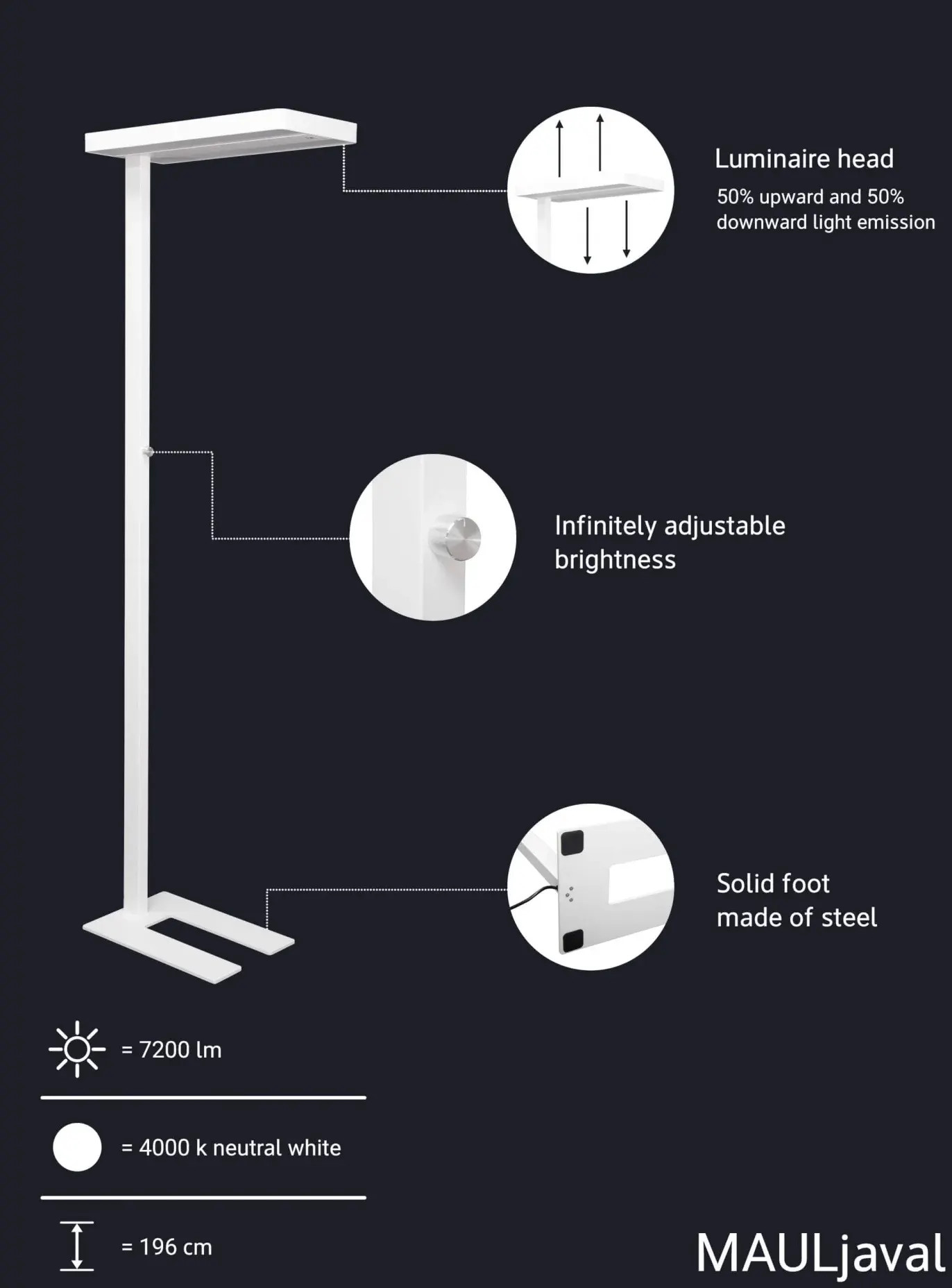 Lampadaire LED MAULjaval offre confort, efficacité et éclairage agréable et optimisé sur votre lieu de travail. Fonction de variation progressive du MAULjaval est pratique et économe en énergie. Le commutateur à variation monté à une hauteur de 1,20 m sur la colonne lumineuse reste facilement accessible. En le tournant, vous pouvez adapter l'éclairage à vos besoins ou à vos activités. Ce commutateur rotatif pratique s'utilise également pour allumer et éteindre la lampe. La lampe à LED MAULjaval diffuse une lumière blanche neutre de 4000 Kelvin. Ce type de lumière est généralement perçue comme étant agréable pour travailler. Le luminaire émet à intensité égale vers le haut et vers le bas, ce qui le rend doublement utile au bureau : Il éclaire à la fois votre espace de travail et la pièce.