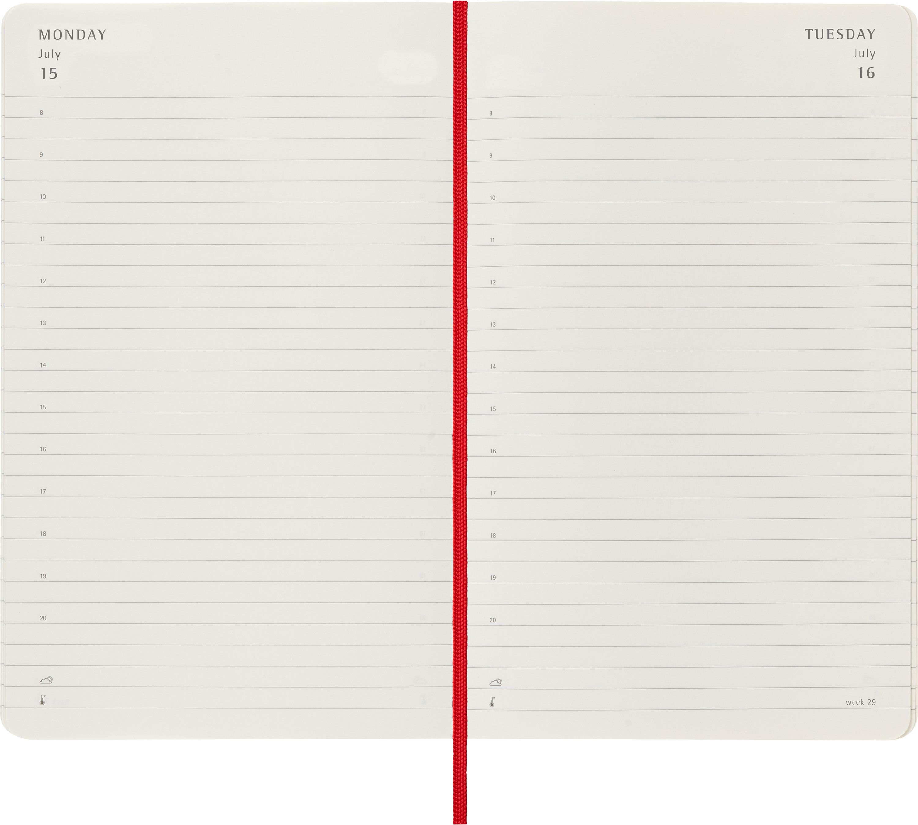 L'agenda journalier Moleskine va de janvier à décembre. Ce calendrier très apprécié, qui comporte une page par jour, est disponible dans de nombreuses couleurs afin d'immortaliser en détail chaque jour de l'année.