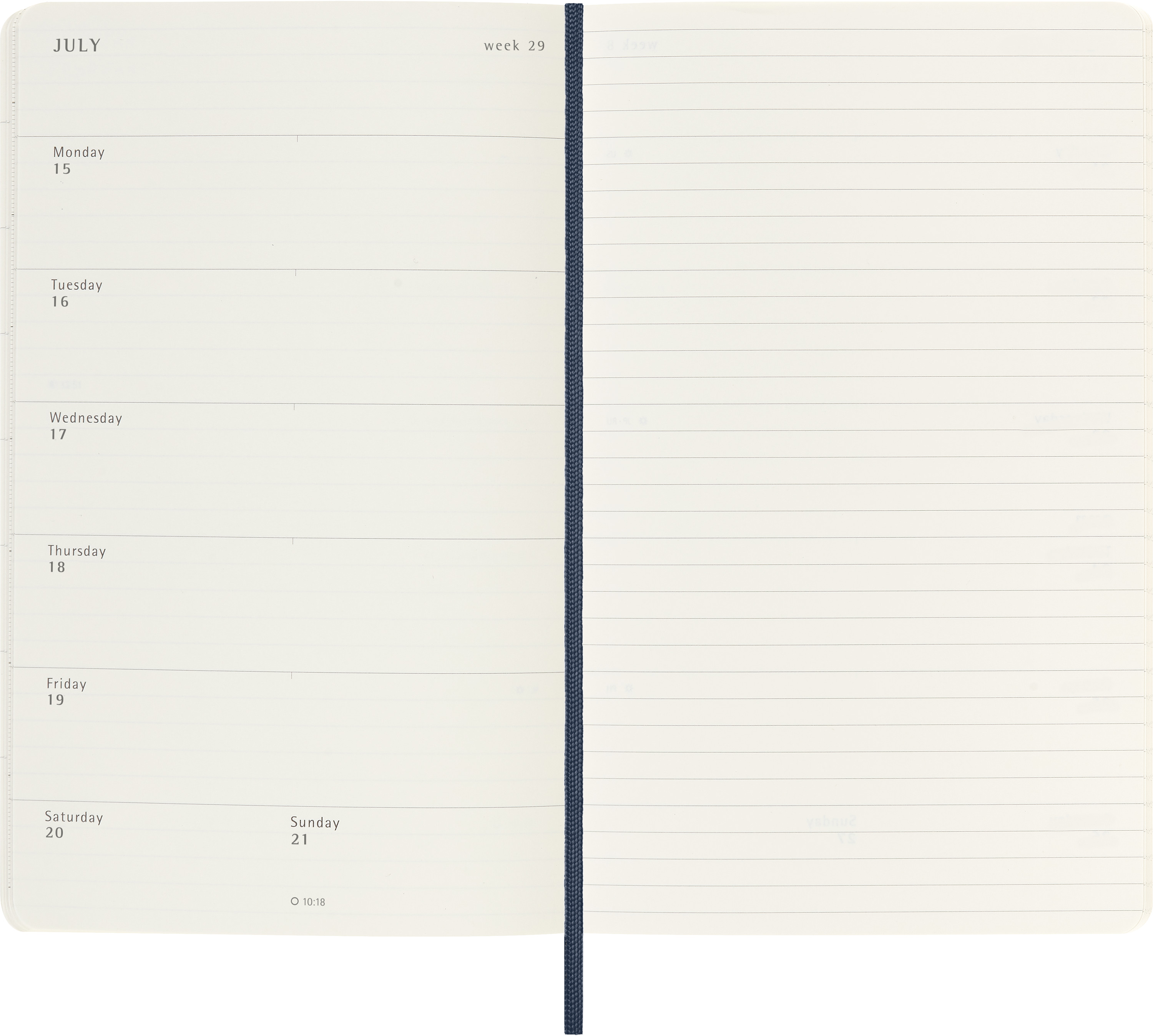 L'agenda / calendrier semainier Moleskine va de janvier à décembre. Avec les rendez-vous de la semaine sur la page de gauche et une page lignée à droite avec de l'espace pour les notes et les idées, ce format d'agenda très apprécié est parfait pour les apprenants, les enseignants et les professionnels.