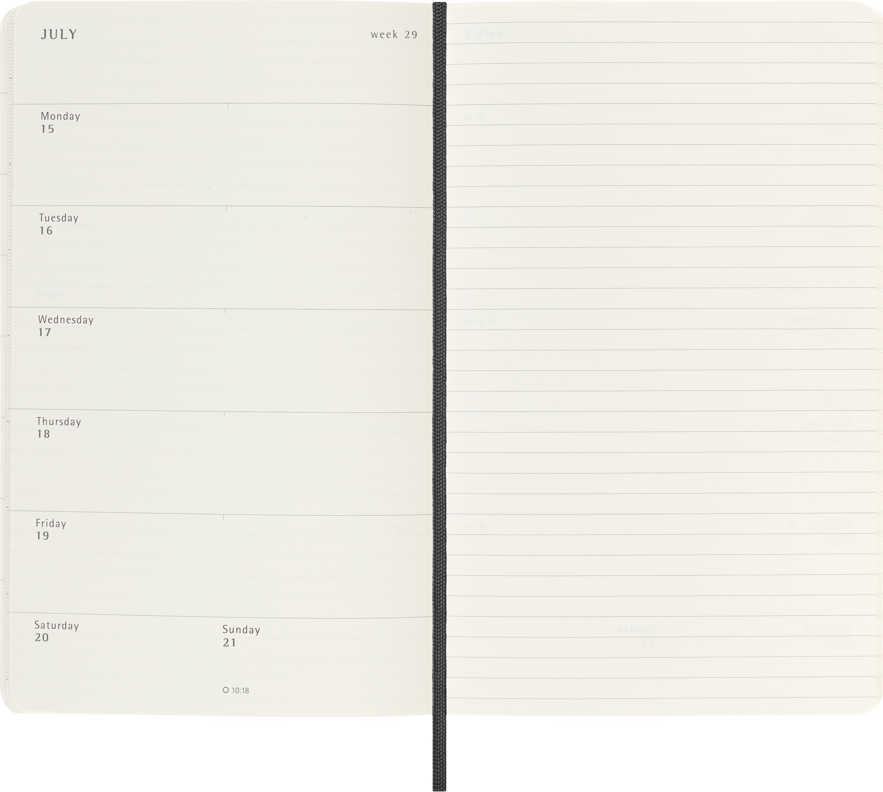 L'agenda / calendrier semainier Moleskine va de janvier à décembre. Avec les rendez-vous de la semaine sur la page de gauche et une page lignée à droite avec de l'espace pour les notes et les idées, ce format d'agenda très apprécié est parfait pour les apprenants, les enseignants et les professionnels.