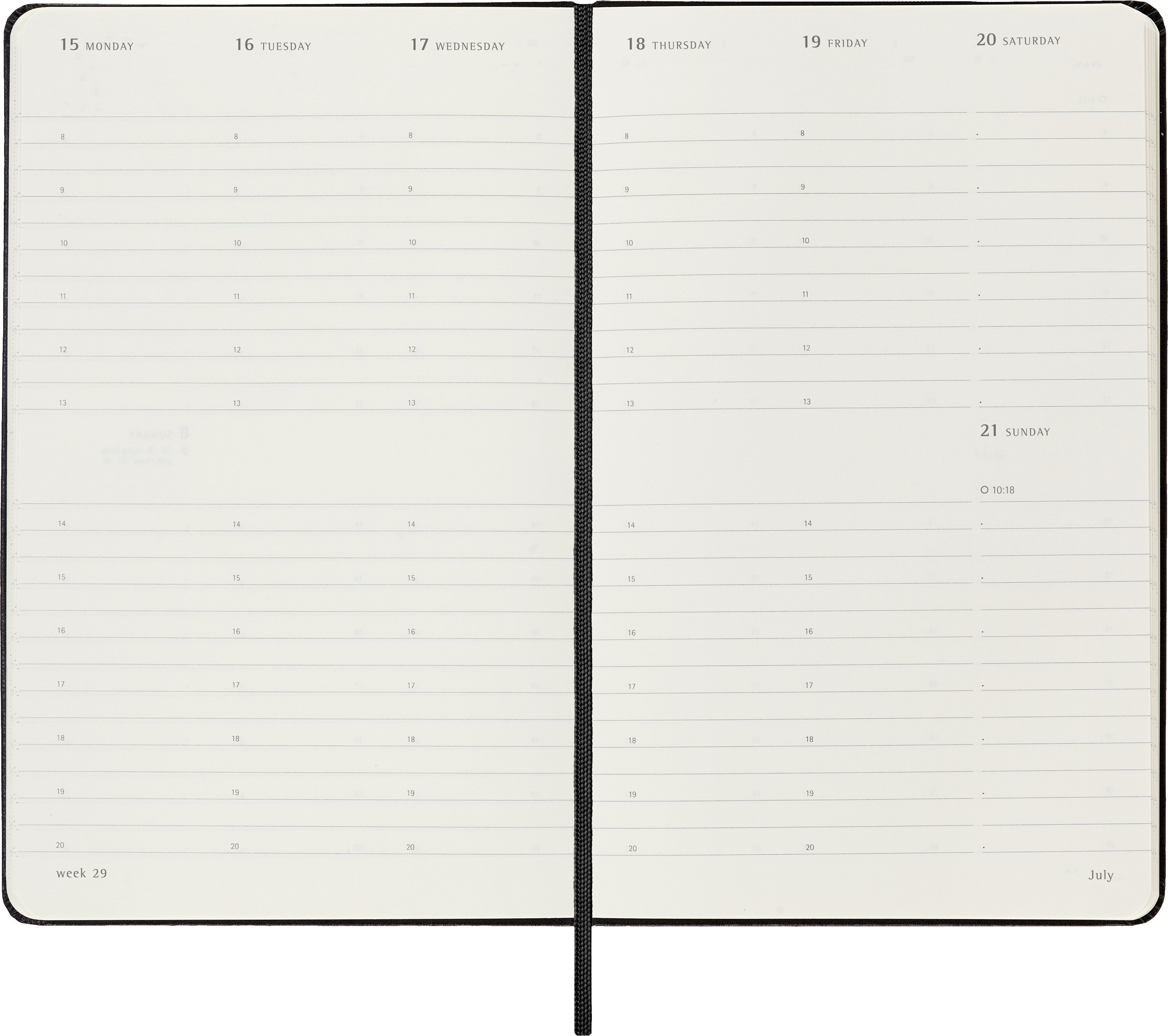 L'agenda semainier vertical Moleskine va de janvier à décembre. Ce calendrier vertical très apprécié, avec les jours de la semaine répartis sur deux pages en haut de chaque page, est parfait pour avoir une vue d'ensemble du planning de la semaine.