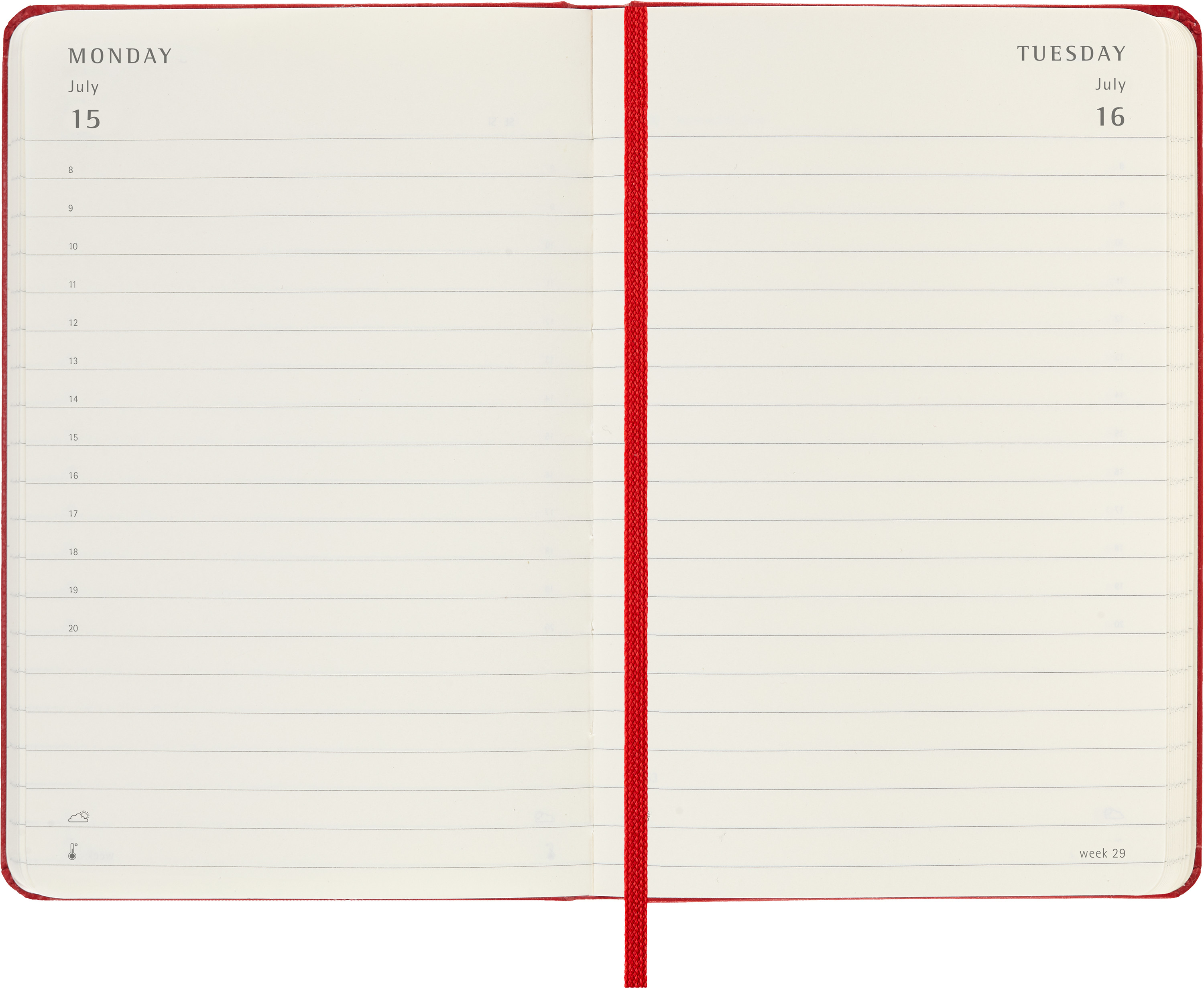 L'agenda journalier Moleskine va de janvier à décembre. Ce calendrier très apprécié, qui comporte une page par jour, est disponible dans de nombreuses couleurs afin d'immortaliser en détail chaque jour de l'année.
