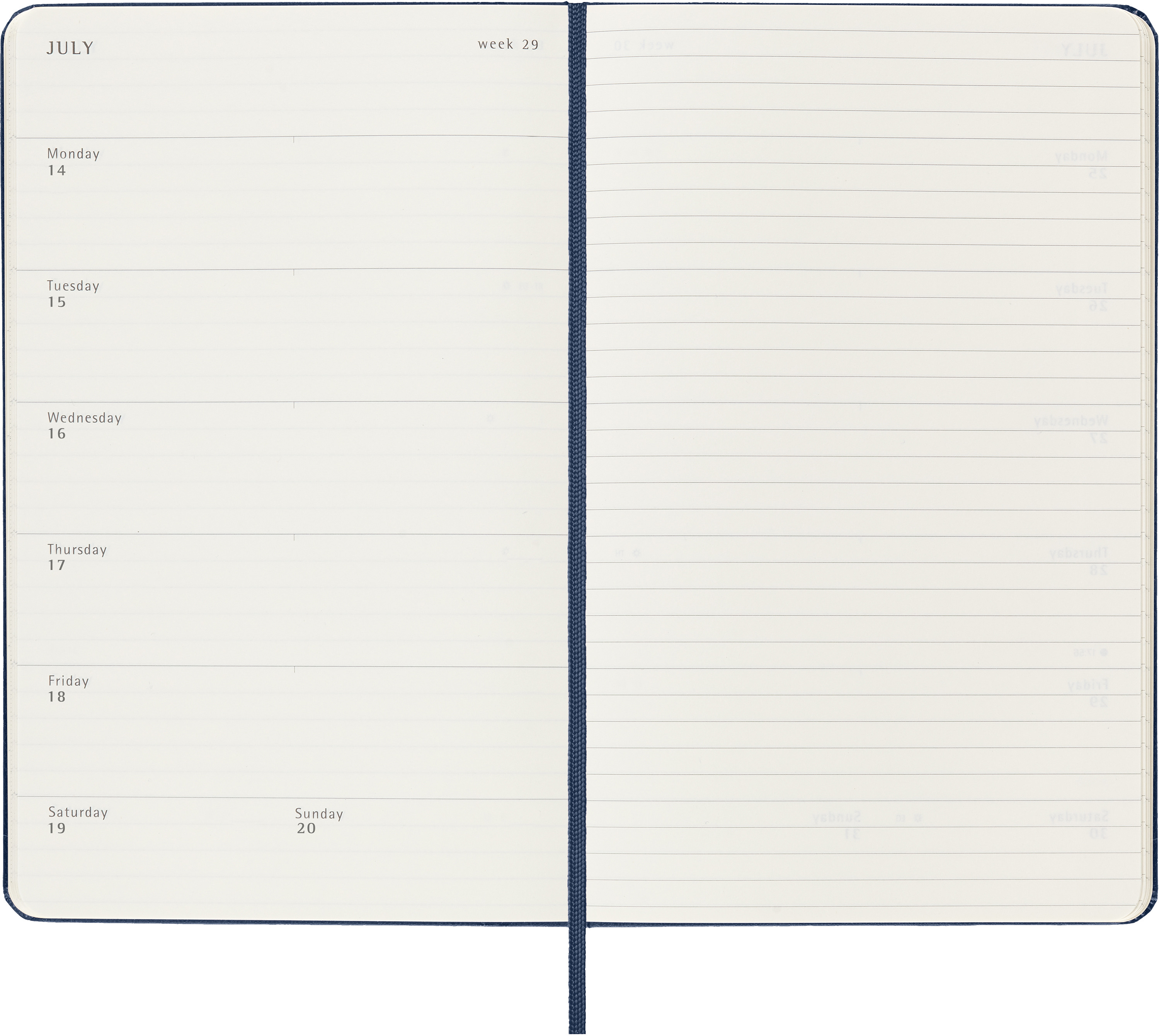 L'agenda hebdomadaire 18 mois de Moleskine va de juillet à décembre. Avec les rendez-vous de la semaine sur la page de gauche et une page lignée à droite avec de la place pour les notes et les idées, ce type de calendrier très apprécié est parfait pour les étudiants, les enseignants et les hommes d'affaires.