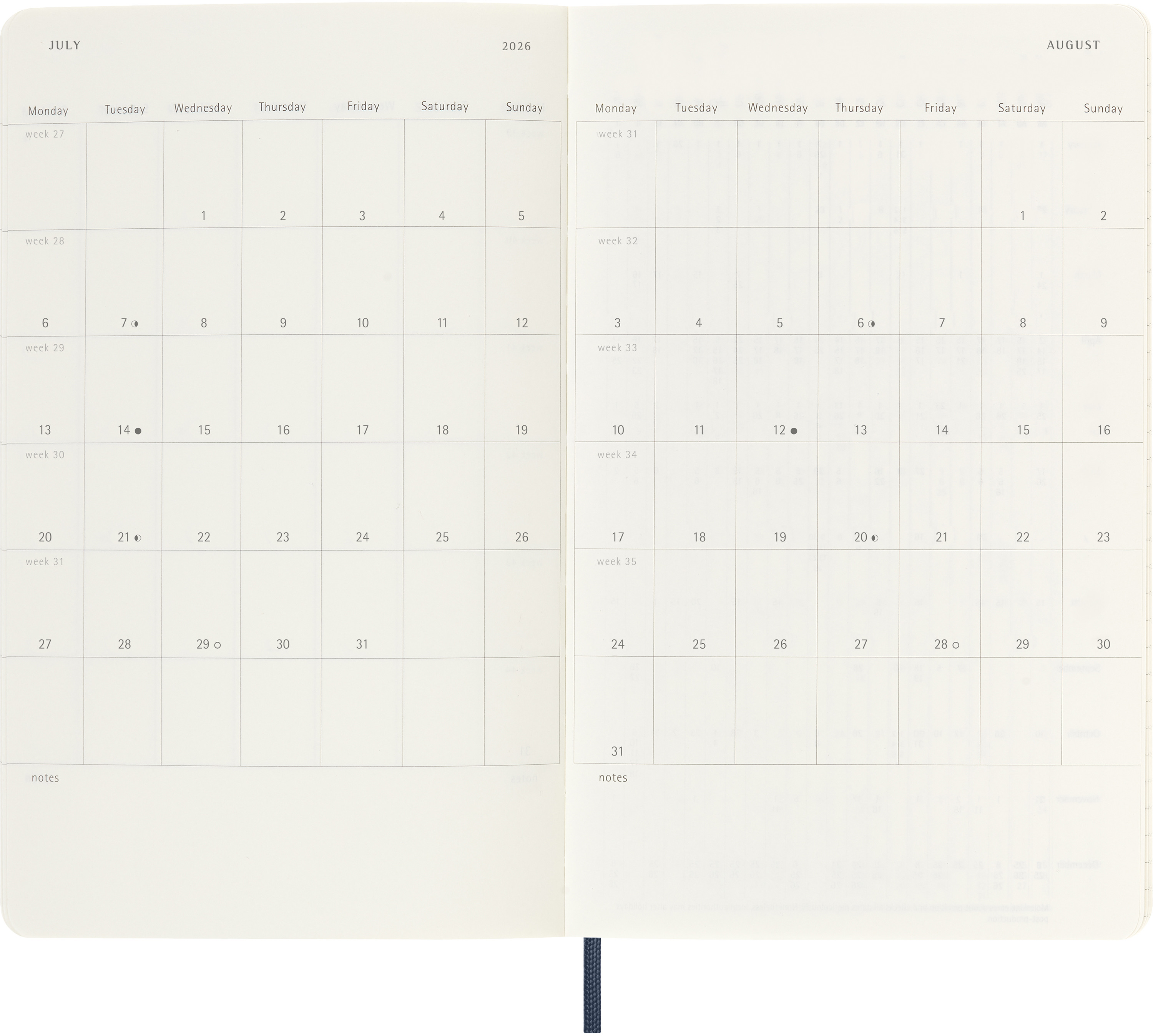 L'agenda hebdomadaire 18 mois de Moleskine va de juillet à décembre. Avec les rendez-vous de la semaine sur la page de gauche et une page lignée à droite avec de la place pour les notes et les idées, ce type de calendrier très apprécié est parfait pour les étudiants, les enseignants et les hommes d'affaires.