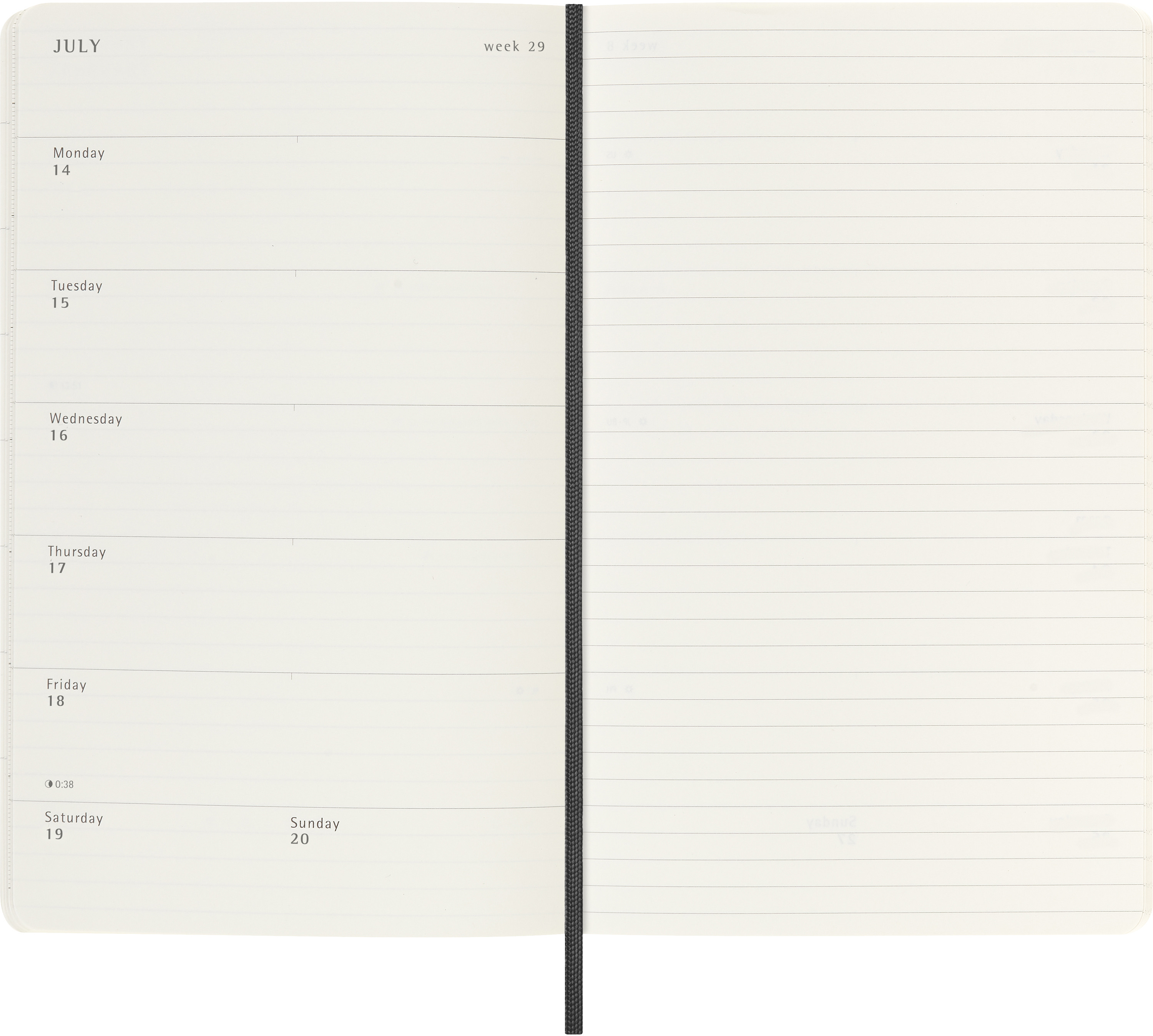 L'agenda hebdomadaire 18 mois de Moleskine va de juillet à décembre. Avec les rendez-vous de la semaine sur la page de gauche et une page lignée à droite avec de la place pour les notes et les idées, ce type de calendrier très apprécié est parfait pour les étudiants, les enseignants et les hommes d'affaires.