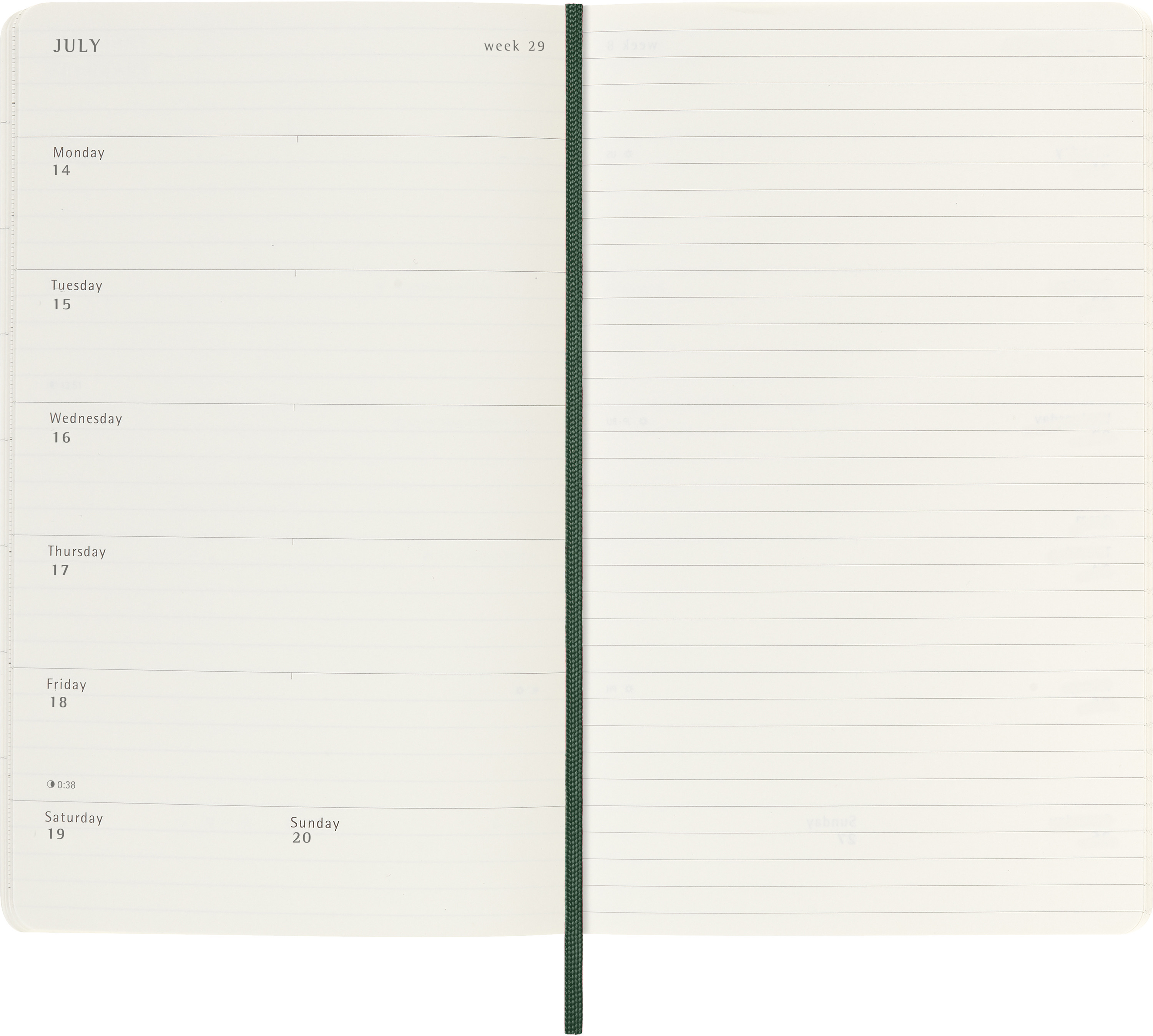 L'agenda hebdomadaire 18 mois de Moleskine va de juillet à décembre. Avec les rendez-vous de la semaine sur la page de gauche et une page lignée à droite avec de la place pour les notes et les idées, ce type de calendrier très apprécié est parfait pour les étudiants, les enseignants et les hommes d'affaires.