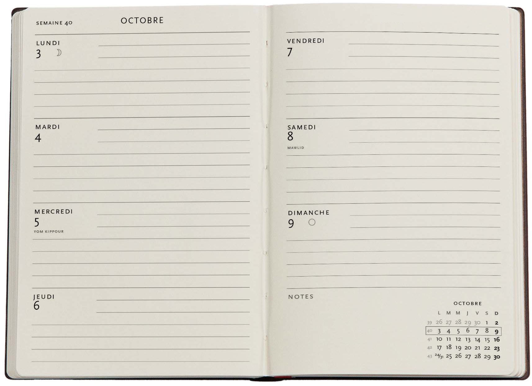 Tous les agendas Paperblanks sont fabriqués avec la reliure de la plus haute qualité, la reliure cousue. Les rabats de la couverture sont composés à 100 % de matériaux recyclés. Le papier d'écriture, fabriqué à partir de pâte à papier issue de forêts gérées durablement, est d'une couleur crème agréable à l'œil. Tous les agendas sont munis de deux rubans de lecture en soie et le dos de la couverture comporte une poche intérieure à soufflet au format horizontal. Dans la poche intérieure dépliante se trouve un carnet d'adresses amovible.