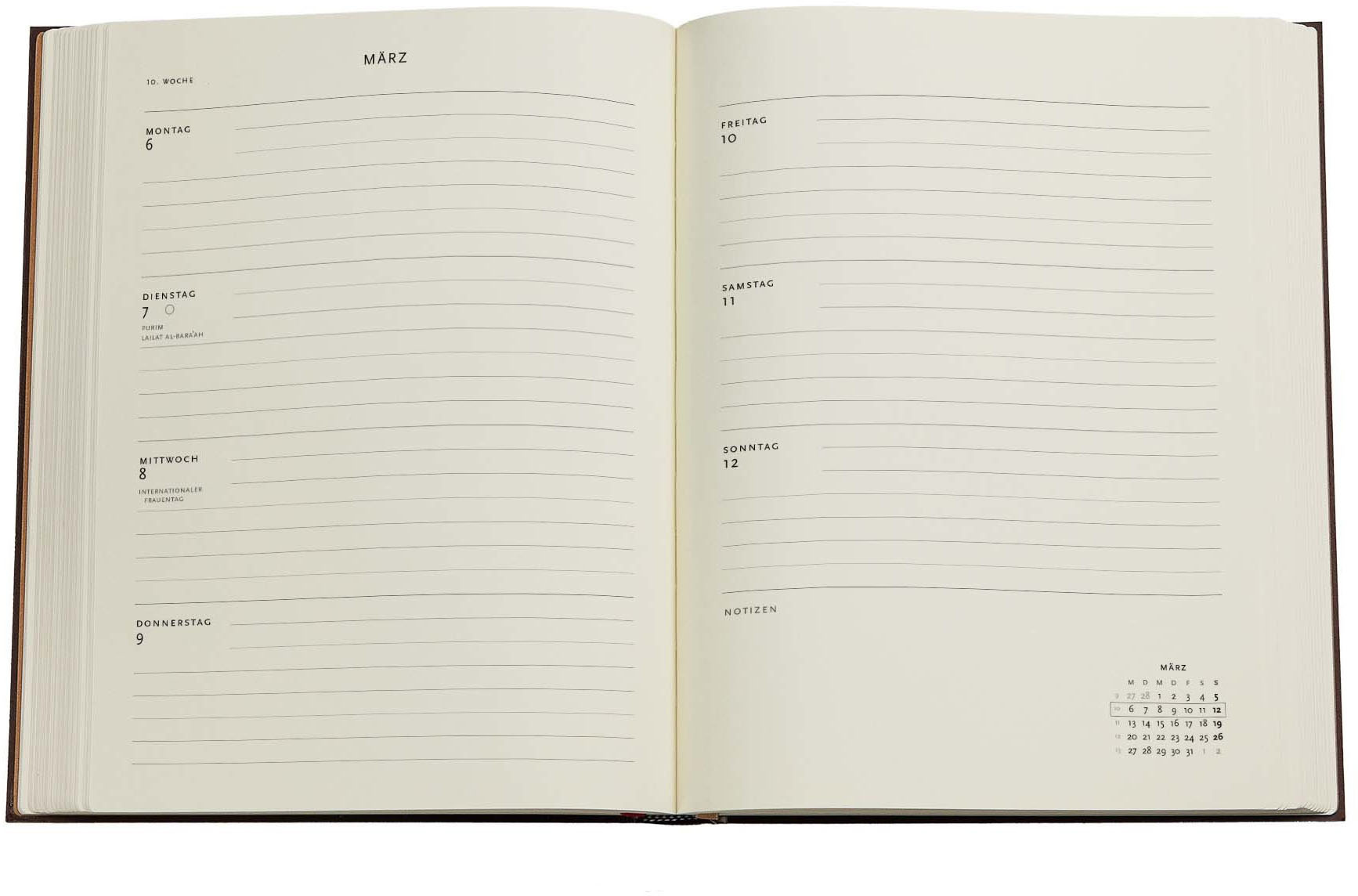 Tous les agendas Paperblanks sont fabriqués avec la reliure de la plus haute qualité, la reliure cousue. Les rabats de la couverture sont composés à 100 % de matériaux recyclés. Le papier d'écriture, fabriqué à partir de pâte à papier issue de forêts gérées durablement, est d'une couleur crème agréable à l'œil. Tous les agendas sont munis de deux rubans de lecture en soie et le dos de la couverture comporte une poche intérieure à soufflet au format horizontal. Dans la poche intérieure dépliante se trouve un carnet d'adresses amovible.