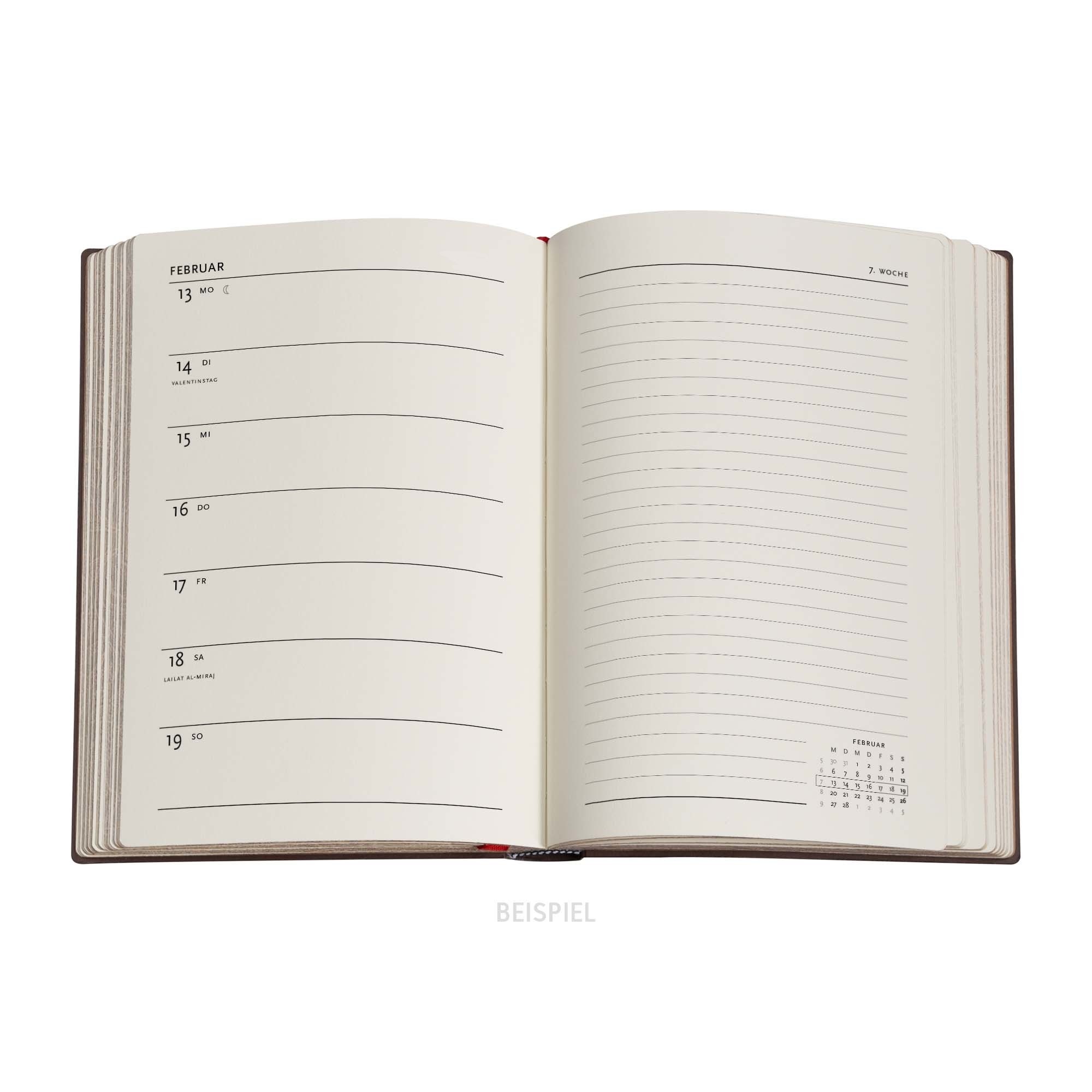 Tous les agendas Paperblanks sont fabriqués avec la reliure de la plus haute qualité, la reliure cousue. Les rabats de la couverture sont composés à 100 % de matériaux recyclés. Le papier d'écriture, fabriqué à partir de pâte à papier issue de forêts gérées durablement, est d'une couleur crème agréable à l'œil. Tous les agendas sont munis de deux rubans de lecture en soie et le dos de la couverture comporte une poche intérieure à soufflet au format horizontal. Dans la poche intérieure dépliante se trouve un carnet d'adresses amovible.