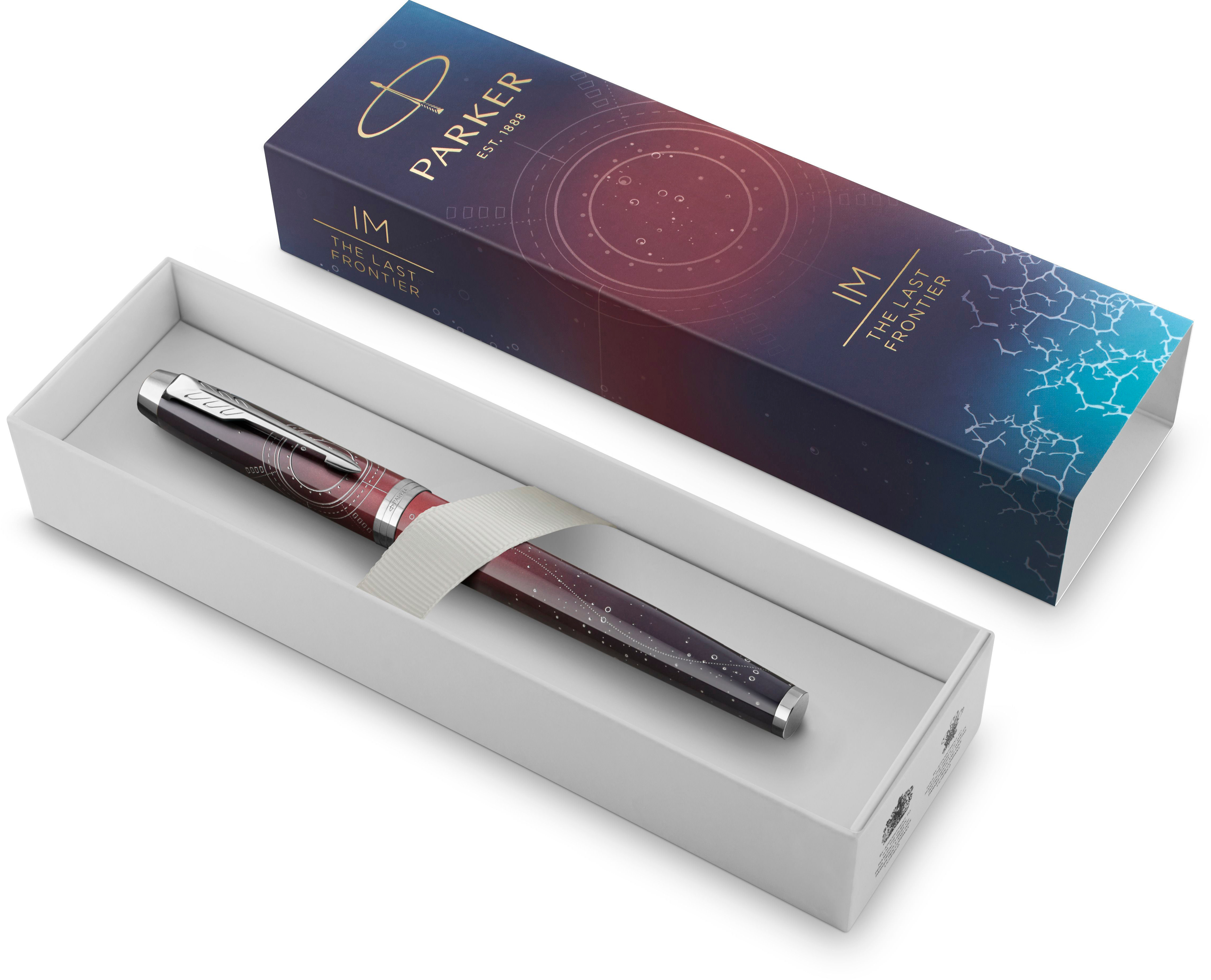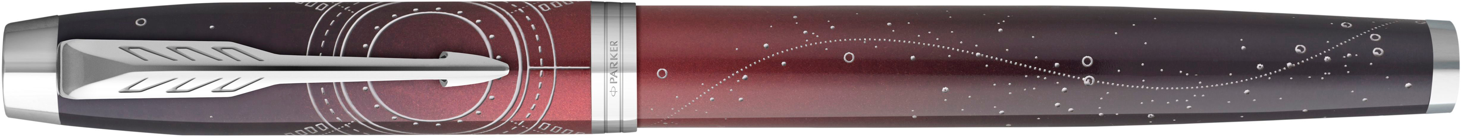 Inspirée par l'univers sans limites qui nous entoure - l'espace - la série PARKER IM PORTAL C.C. est un hommage à ceux qui dépassent leurs limites pour explorer l'inconnu. Le capuchon et le corps laqués de rouge à noir nuit, avec un motif minutieusement gravé, sont complétés par des pièces décoratives chromées et l'agrafe caractéristique en forme de flèche de PARKER. Le roller tient bien en main, se caractérise par un design intemporel et des propriétés d'écriture parfaites.