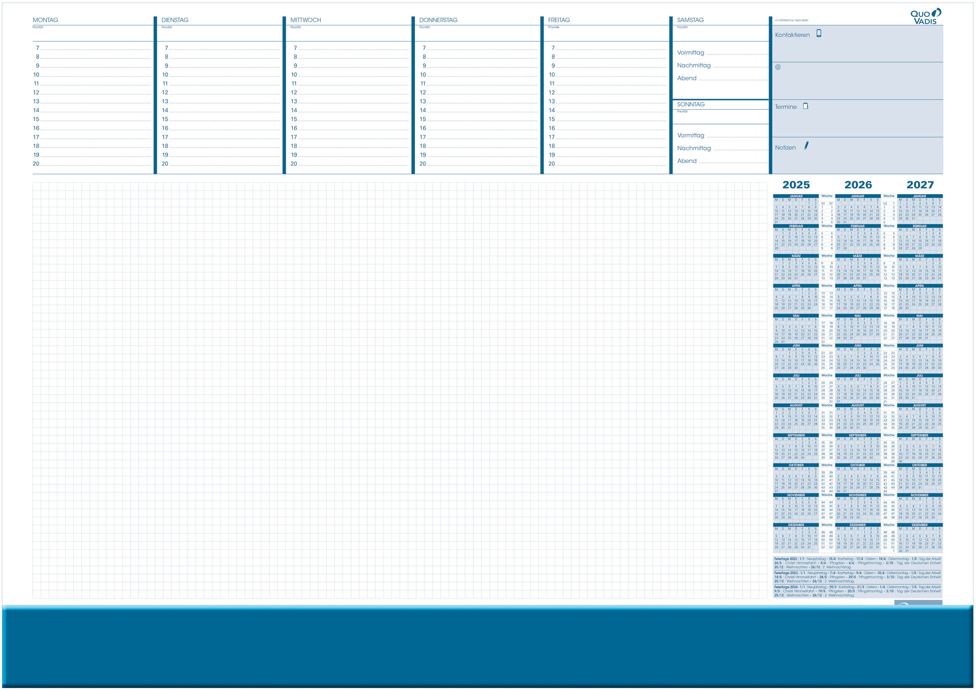 Une gestion du temps parfaite, moins de stress - l'agenda de bureau Quo Vadis est un outil pratique pour planifier votre quotidien. Comme une semaine est visible sur une double page, vous avez toujours votre semaine sous la main.