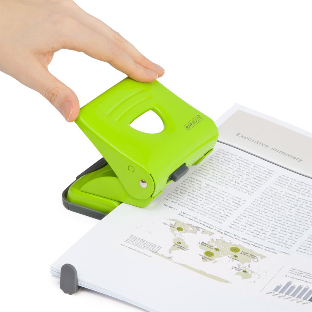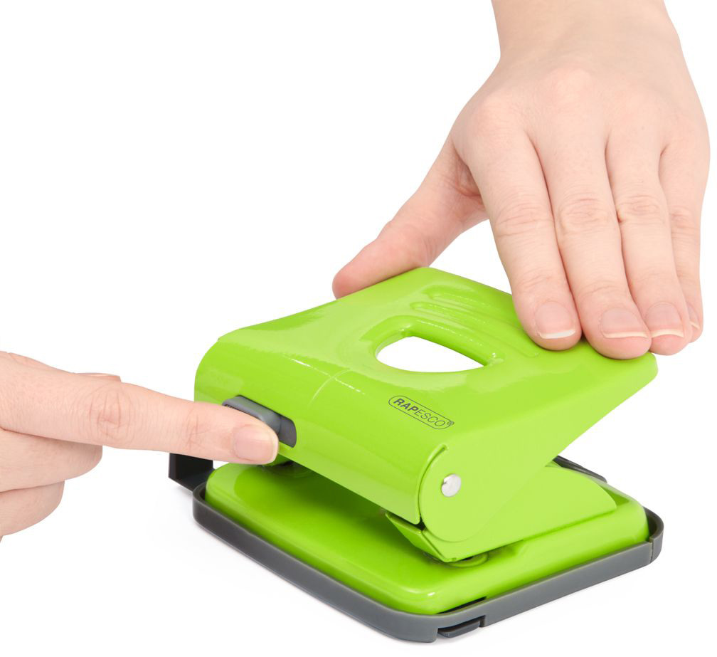 Der Rapesco 825 Locher aus robustem Metall bietet alles, was ein guter Locher braucht: Kapazität für 25 Blatt, abgehärtete Lochstanzen für einen sauberen Schnitt, einen sperrbaren Griff für höchste Präzision sowie eine Metallbasis mit angepasster Gummi-Klappe für die einfache Entleerung.