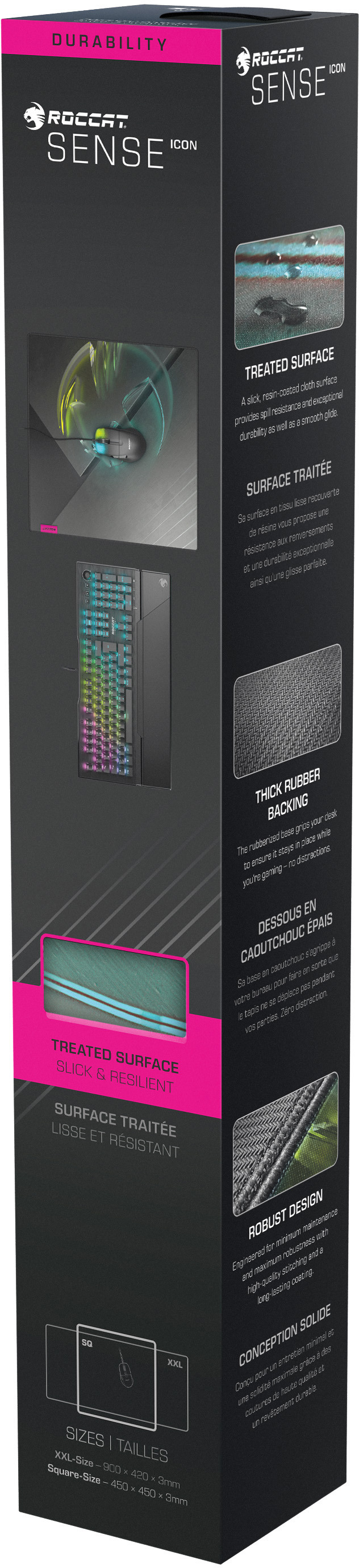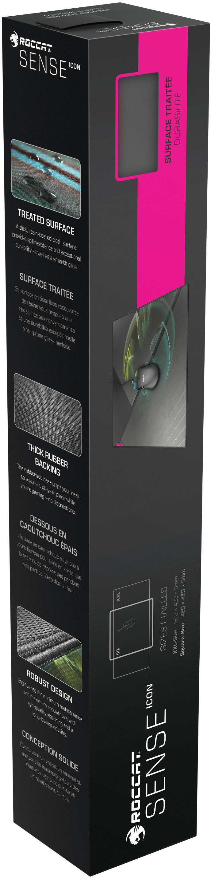 Le motif personnalisé du ROCCAT® Sense™ Icon est conçu pour les fans de la marque. La surface du tissu traité à la résine durable offre une finition résistante à l'eau et une glisse fluide, tandis que la base confortable en caoutchouc épais maintient le tapis en place. Disponible en format Carré et XXL, les dimensions du Sense™ Icon sont adaptées à vos besoins.