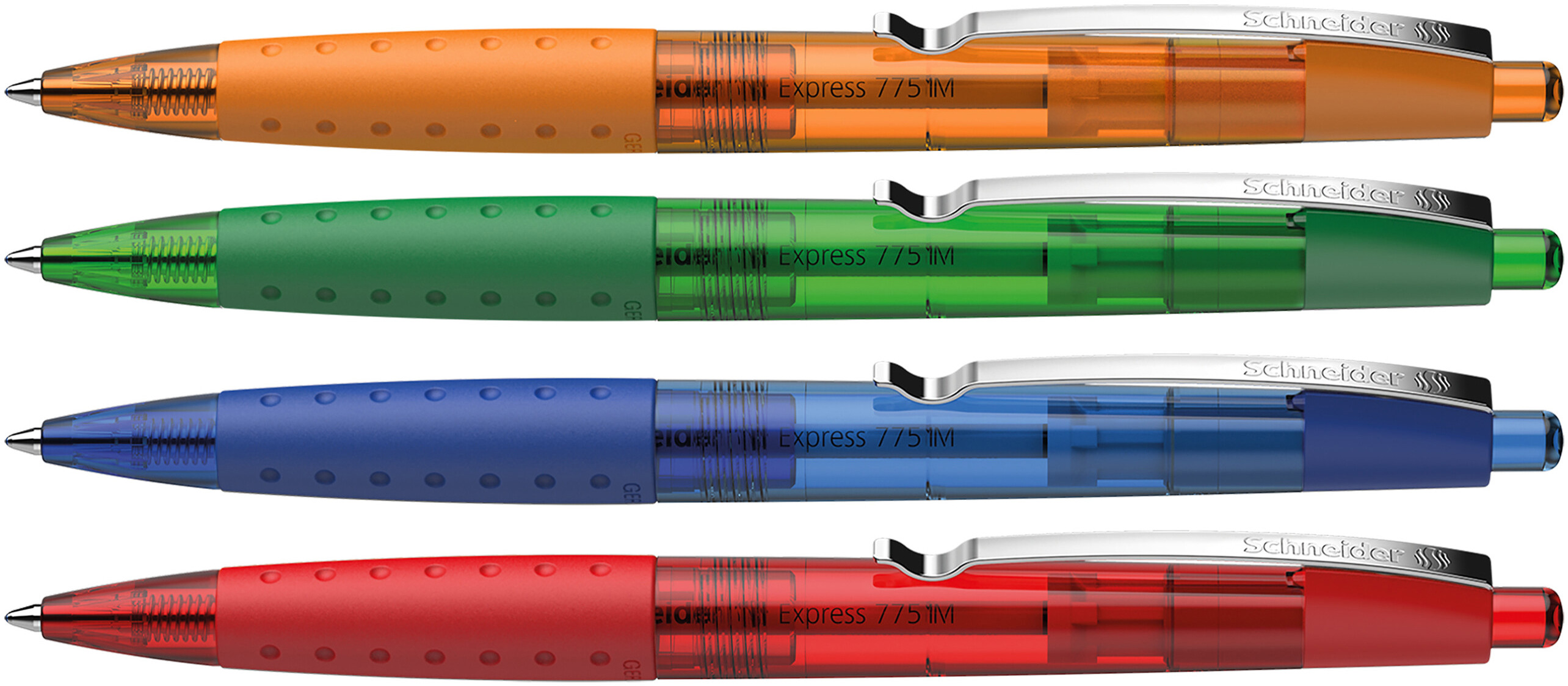Stylo à bille rétractable avec zone Soft-Grip souple et antidérapante pour un confort d'écriture maximal. Le clip métallique stable et les composants plastiques robustes garantissent une longue durée d'utilisation. Couleur du corps (transparent) = couleur d'écriture bleue. Mine Schneider Express 775 M interchangeable avec pointe en acier inoxydable résistante à l'usure. Plug & Play - adaptation universelle de la mine. L'encre est indélébile selon la norme ISO 12757-2. Largeur de trait 0,5 mm. Contenu de la boîte : 20 pièces assorties.