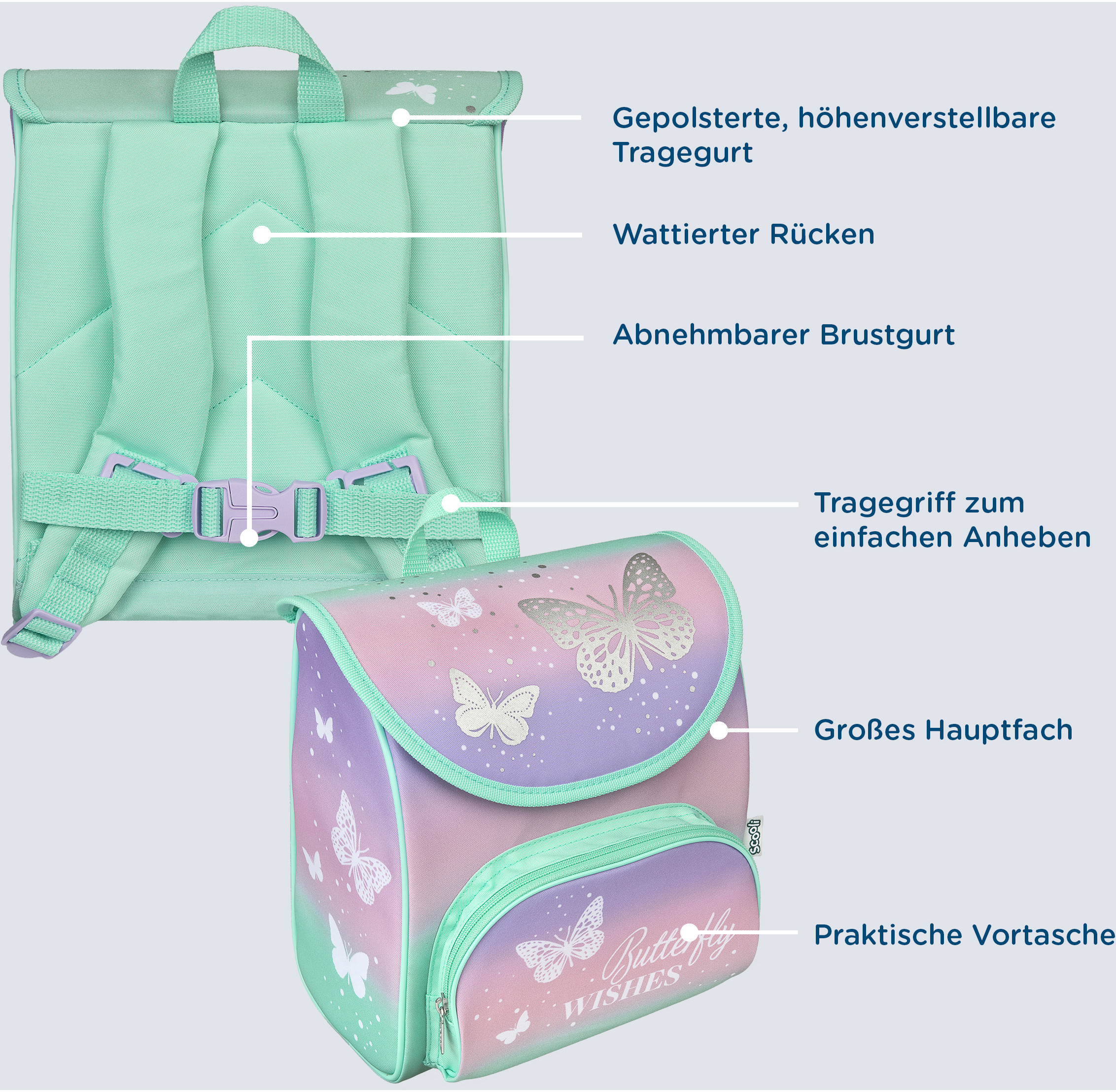 Vorschulranzen mit grossem Hauptfach mit Klettverschluss, kleine Vortasche mit Reissverschluss, Tragegriff, höhenverstellbare gepolsterte Träger, gepolsterter Rücken, mit abnehmbaren Brustgurt, Volumen ca. 6,5 Liter