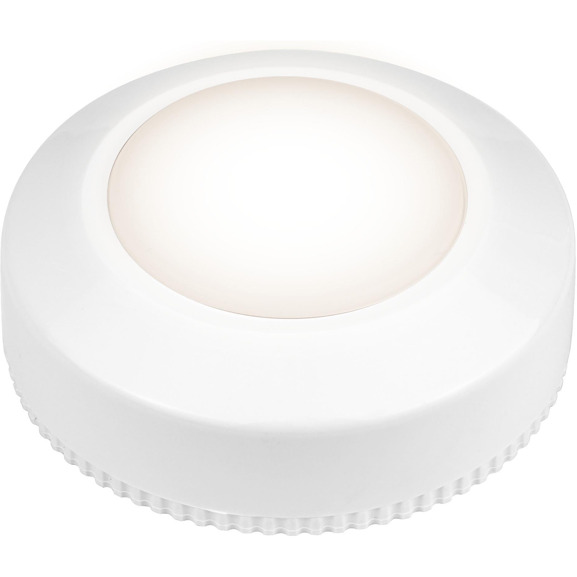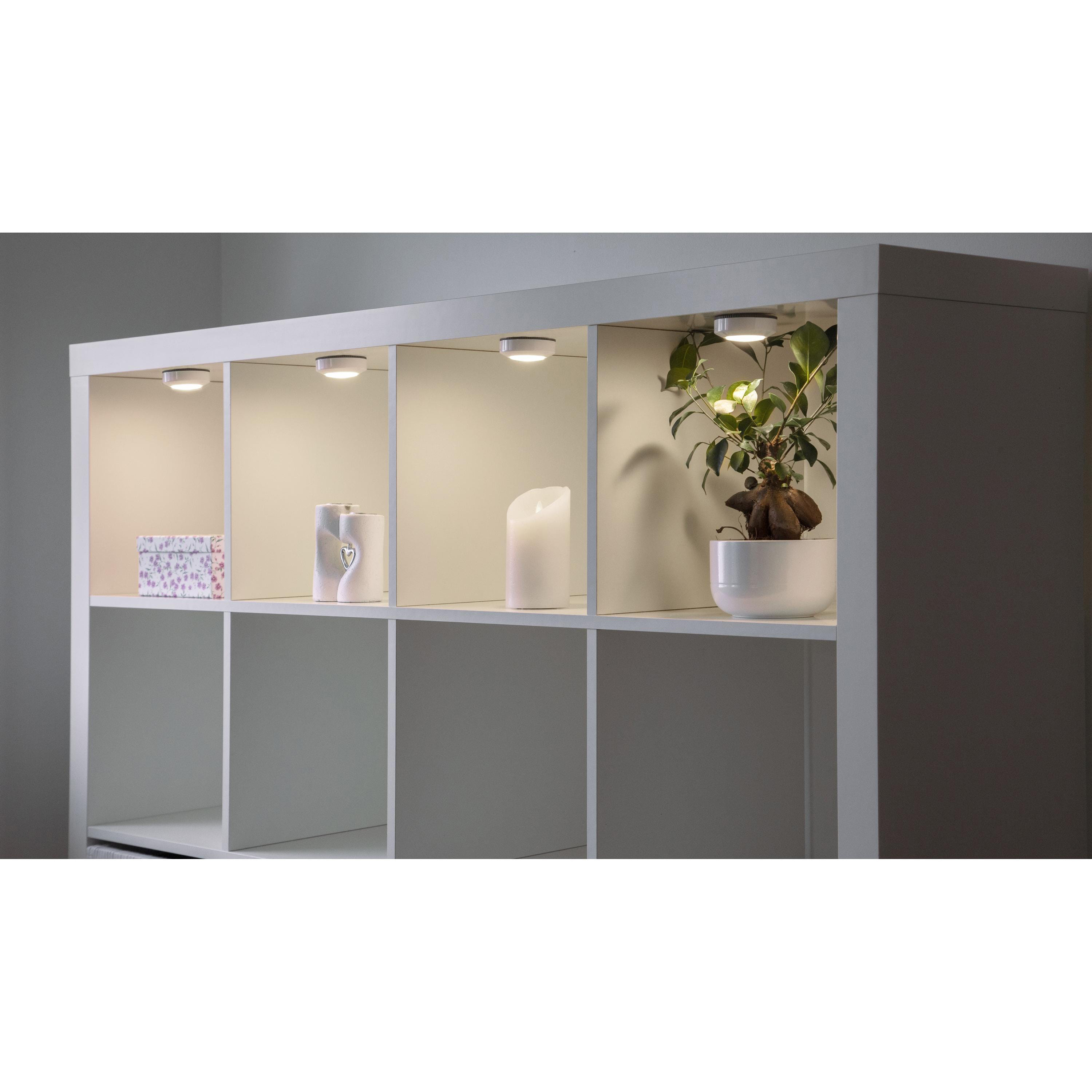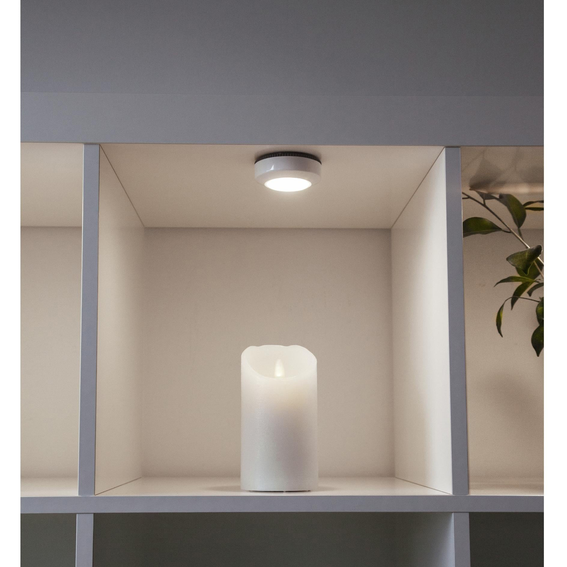 Paquet de 3 LED Puck, parfait pour les penderies, les rangements et autres coins sombres où vous avez besoin d'un peu plus de lumière • fonction push intégrée pour allumer la lampe • il suffit d'appuyer au centre • la fixation de la lampe se fait grâce à l'adhésif autocollant au dos • fonctionne avec 3 piles AAA (non incluses)