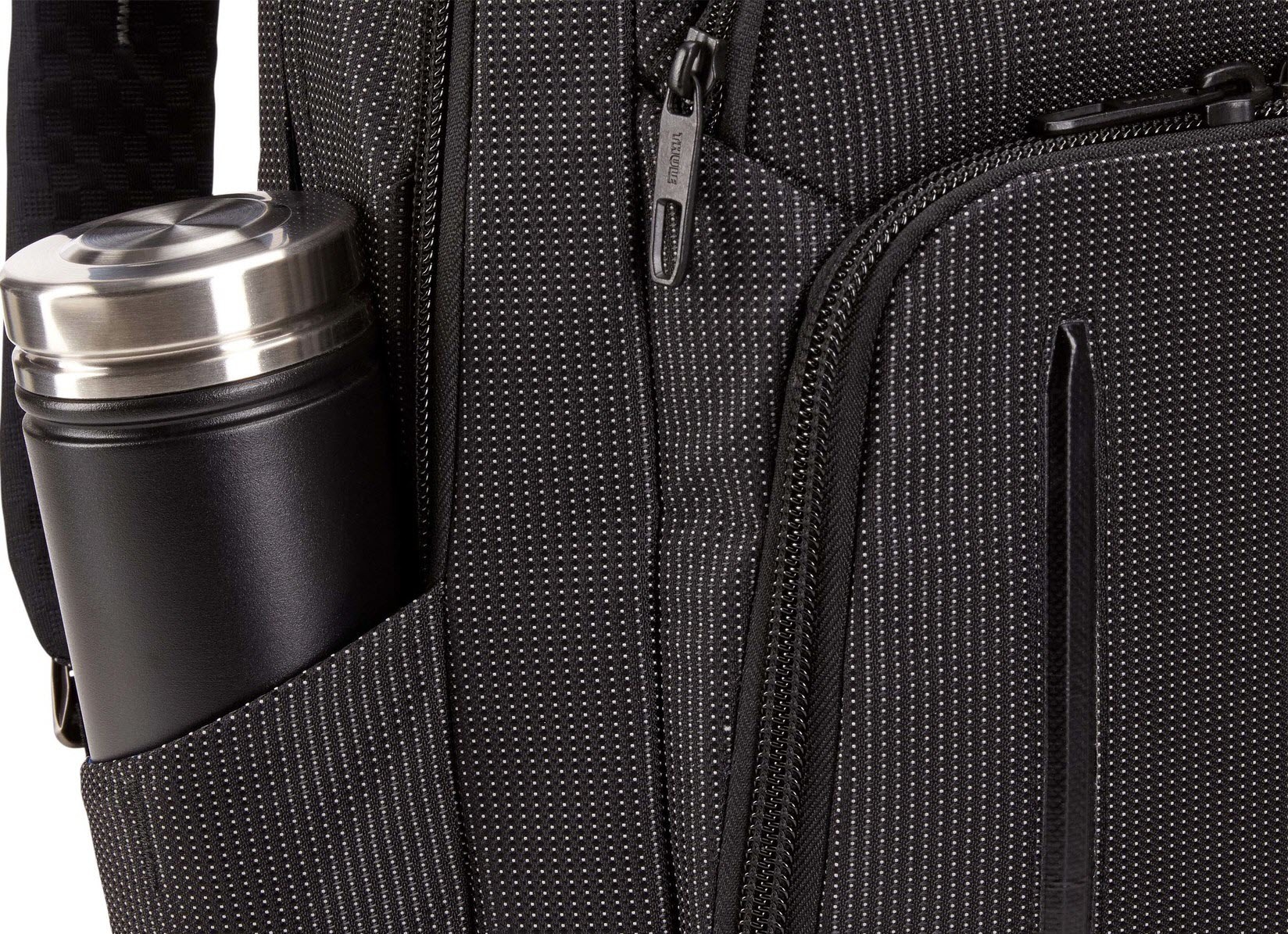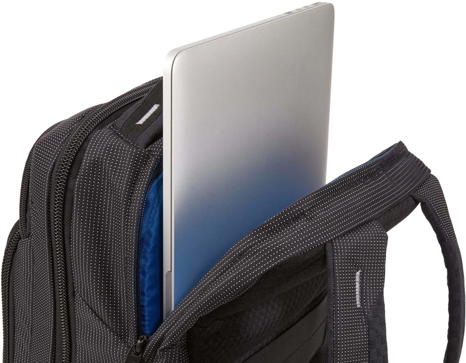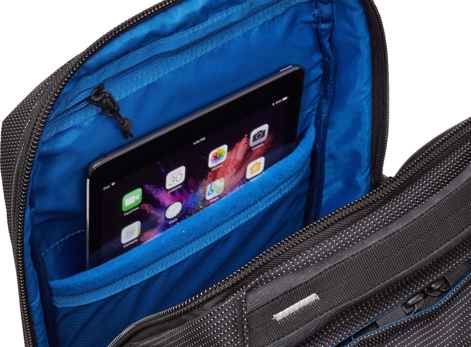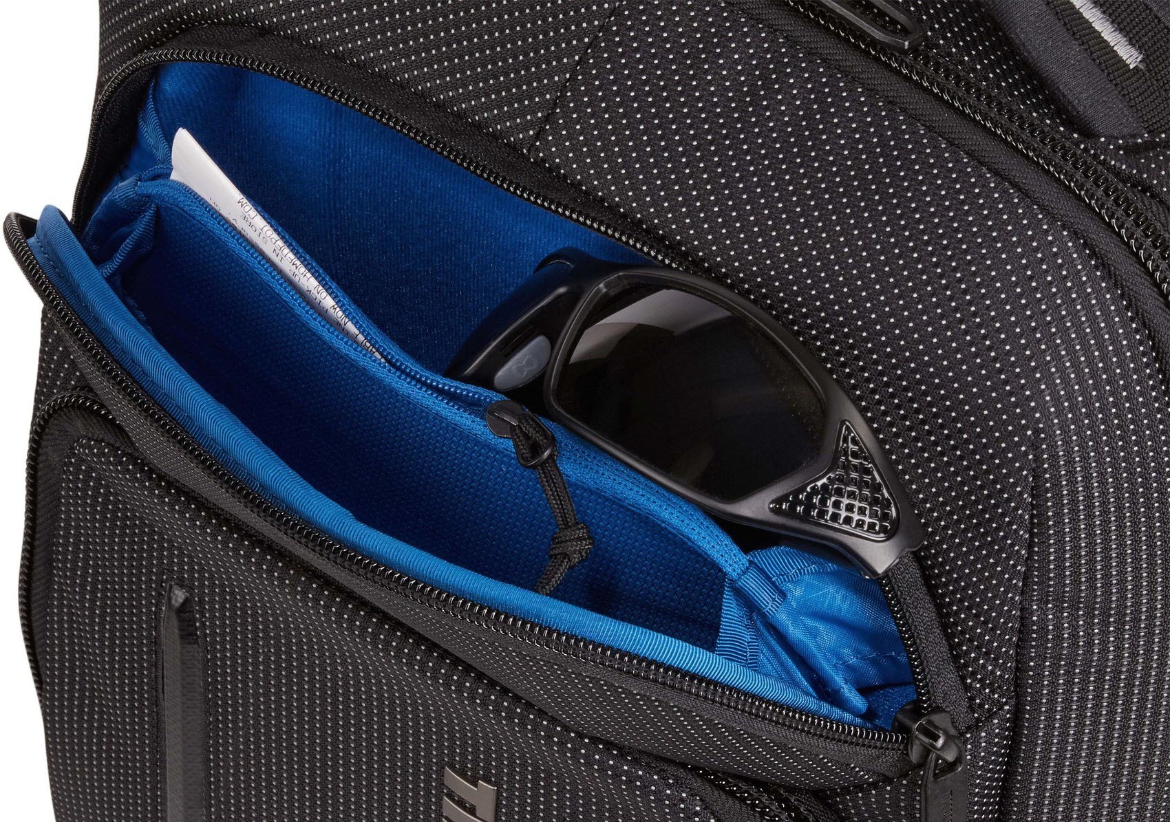 Le sac à dos pratique Crossover 2 est doté d'un compartiment SafeZone breveté, facile d'accès et résistant à la pression. Conserve un ordinateur portable protégé dans le compartiment séparé et rembourré de conception brevetée "SafeEdge". Organise les petits appareils électroniques et les accessoires dans les poches avant, les passants élastiques, la poche en filet zippée et le système de gestion des câbles "PowerSocket" pour les recharger en cours de route. Une tablette jusqu'à 10,1 pouces peut également être protégée dans la pochette de rangement séparée avec une doublure intérieure douce. La répartition du compartiment principal comprend une poche en filet avec fermeture éclair ainsi qu'une grande poche à insérer pour ranger des objets. Même une bouteille d'eau ou un parapluie peuvent être rangés dans les poches latérales renforcées à fermeture éclair. Protégez votre identité et vos informations personnelles avec la pochette de protection RFID. Fixez le sac à dos en toute sécurité à un trolley à l'aide de la boucle à bagages.